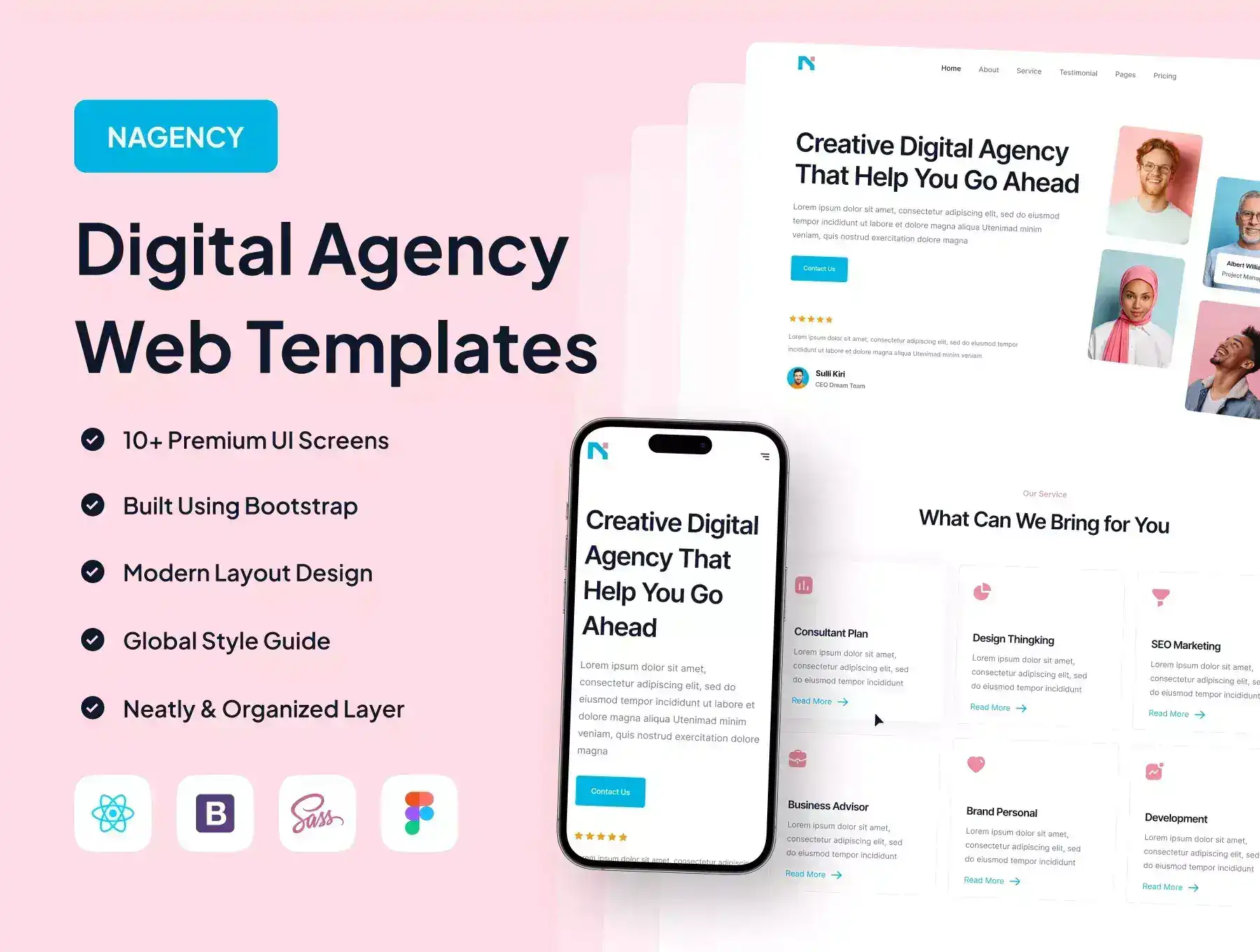 NAGENCY is a collection of 10+ HTML landing page templates with clean premium screens for developing your digital marketing strategy. A beautiful business portfolio template from our Kit that you can customise in minutes. This package was constructed utilising the Bootstrap framework. This premium SAAS template was designed to expedite the designing and development process, and it is easily modifiable with a stunning colour scheme, font sources, and style options.