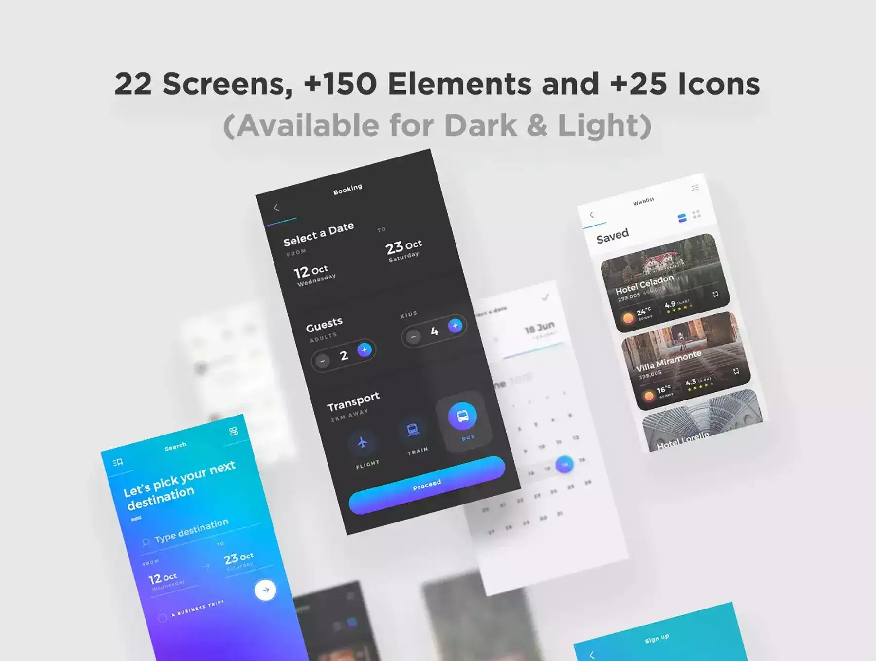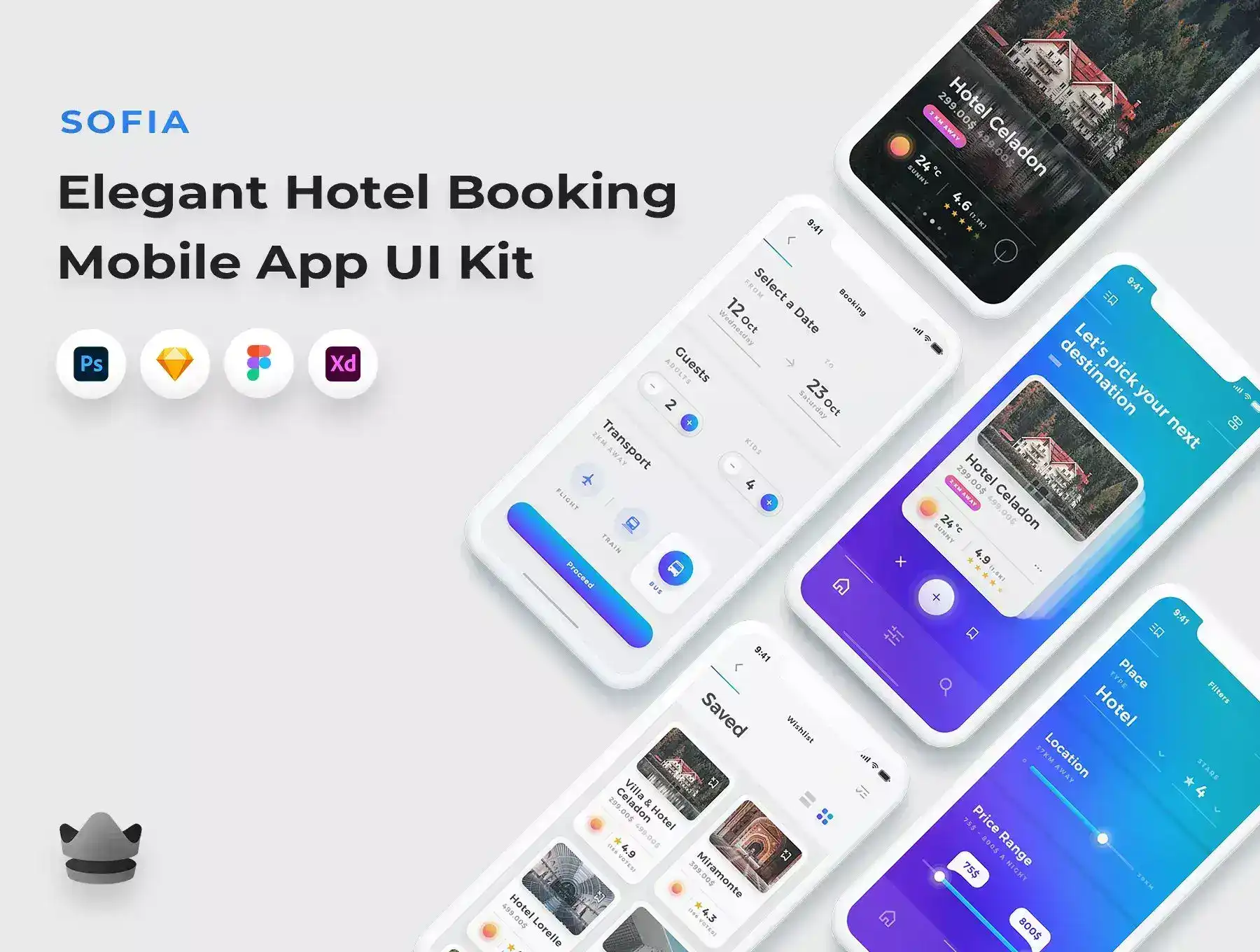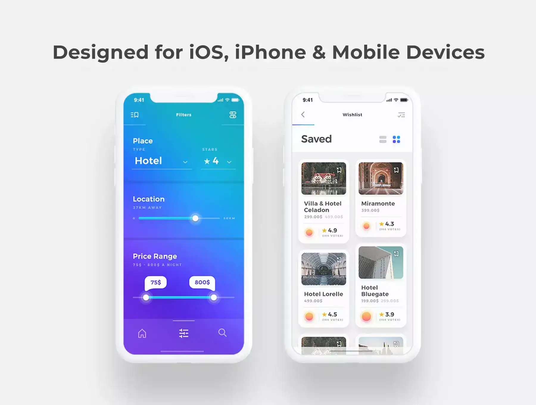 Sofia is an elegant and modern hotel booking and traveling app UI kit designed to fit right into the new iOS, iPhone and all mobile devices.