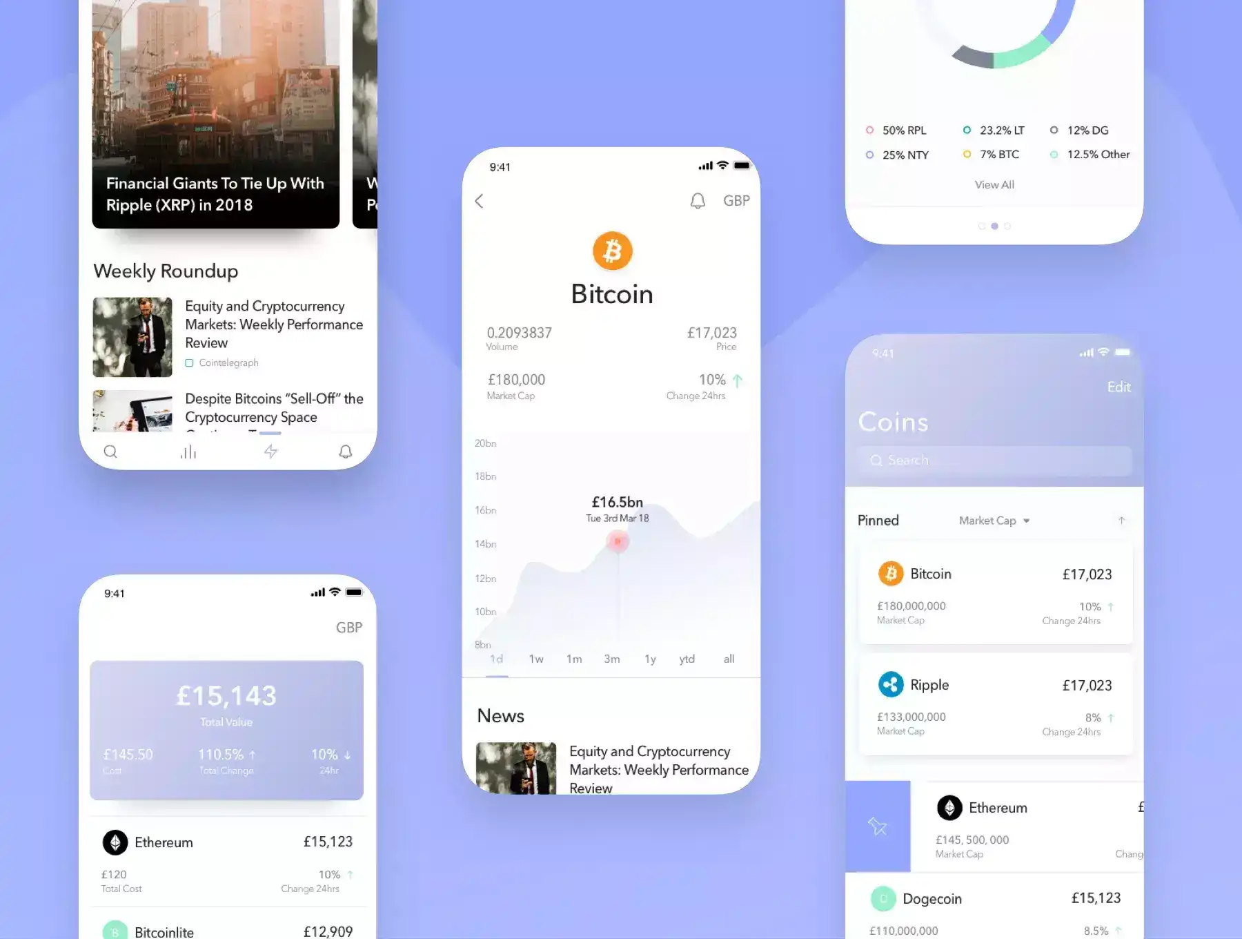 The screens include; a portfolio page with detailed analytics, a news feed, alerts, coin detail pages and many more.