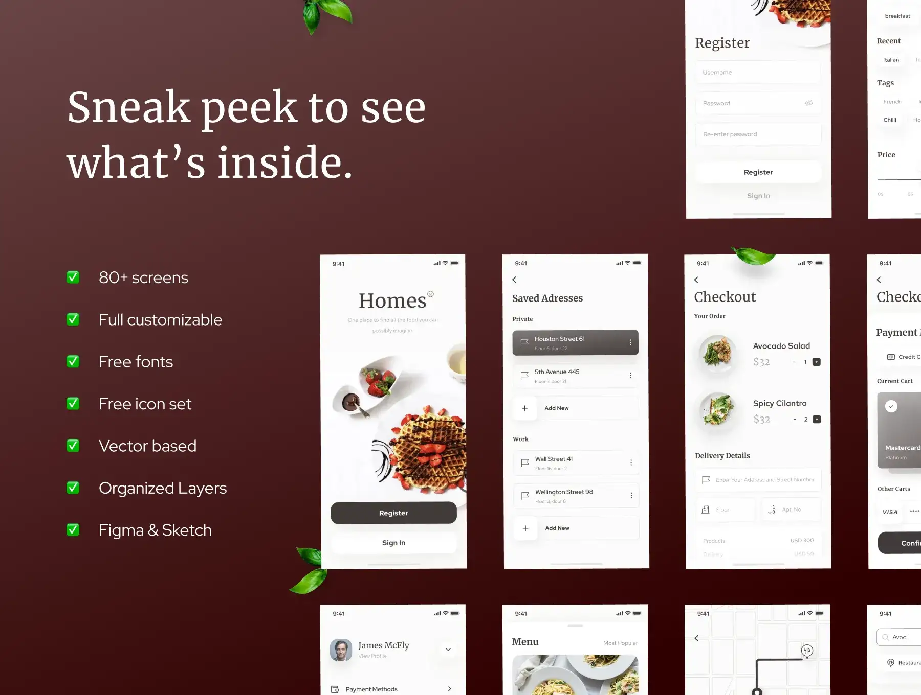 Homes - Food Delivery App is polished UI Kit for food delivery. It's an entire app ready for development! Visual direction is not your regular fast food app. It's made for classy restaurants and businesses. Combination of desaturated colors and serif fonts makes it look amazing. Entire UX is already tested with actual people so we know it's bullet-proof in terms of usability.