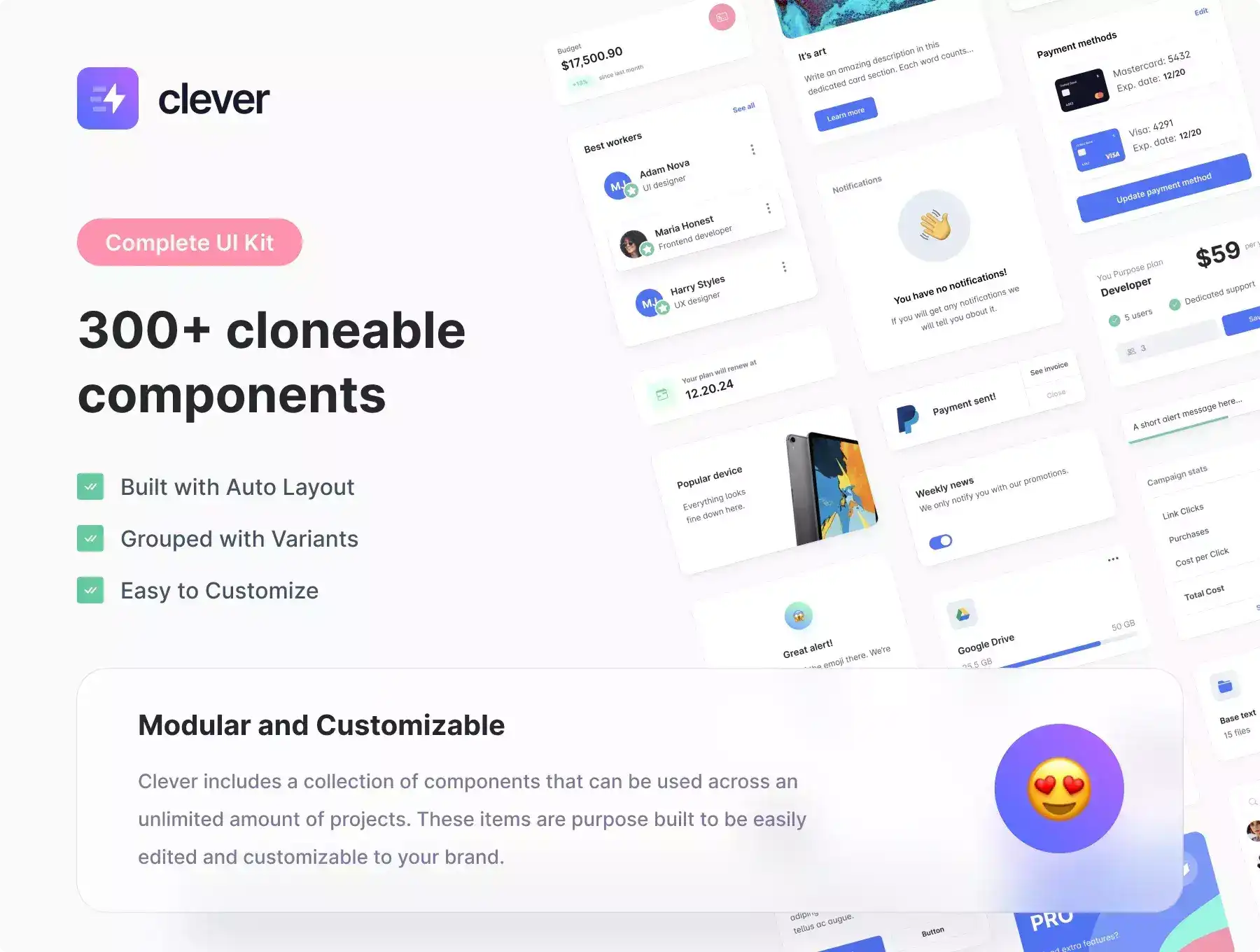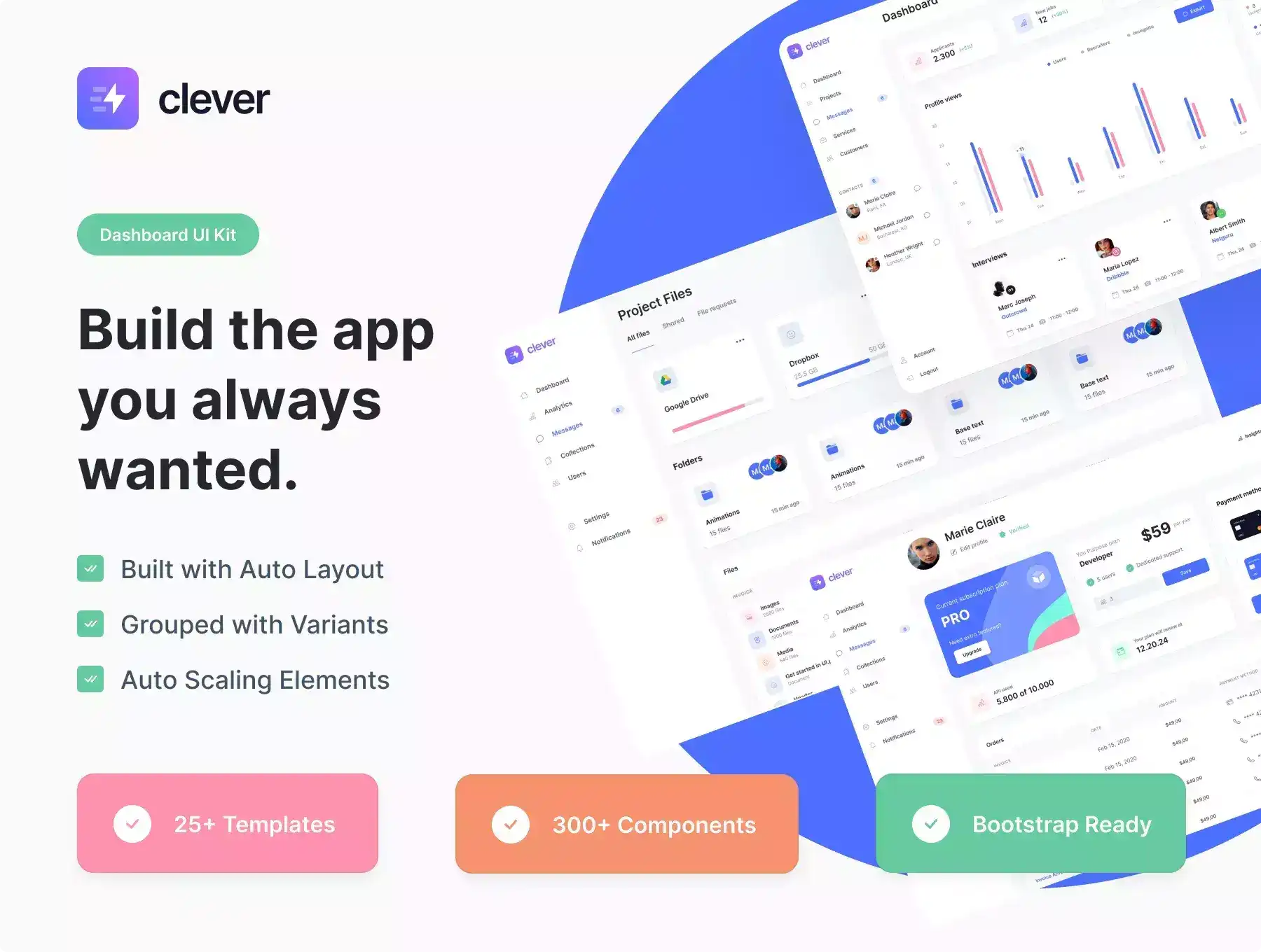 Clever is a modern Dashboard UI Kit for Figma professionally designed by Webpixels to support designers in creating modern user interfaces faster and better.