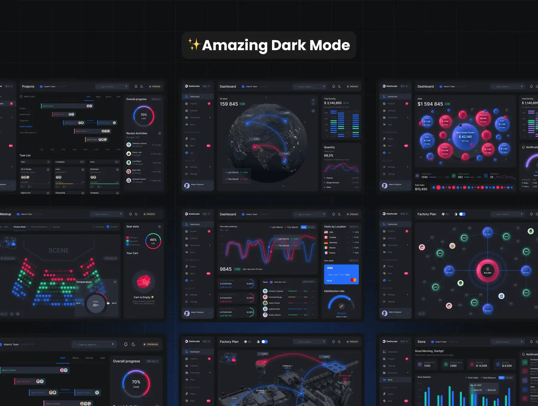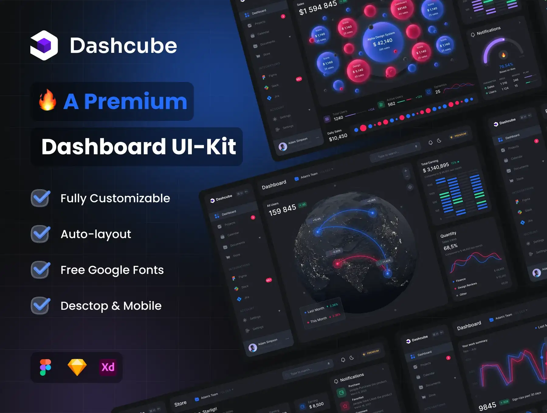 A modern and creative dashboard template for Figma, Sketch and Adobe XD focused on dark colors and 3d. Dashcube includes 100+ widgets, charts, graphics, tables and more. All the components are vector-based and fully customizable. All the fonts used are free.