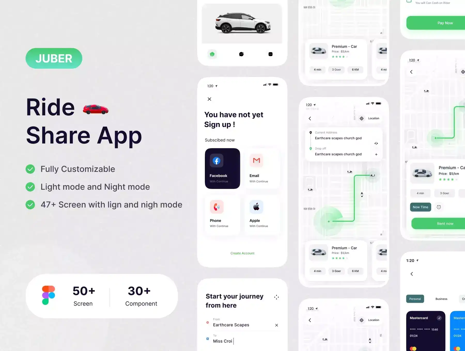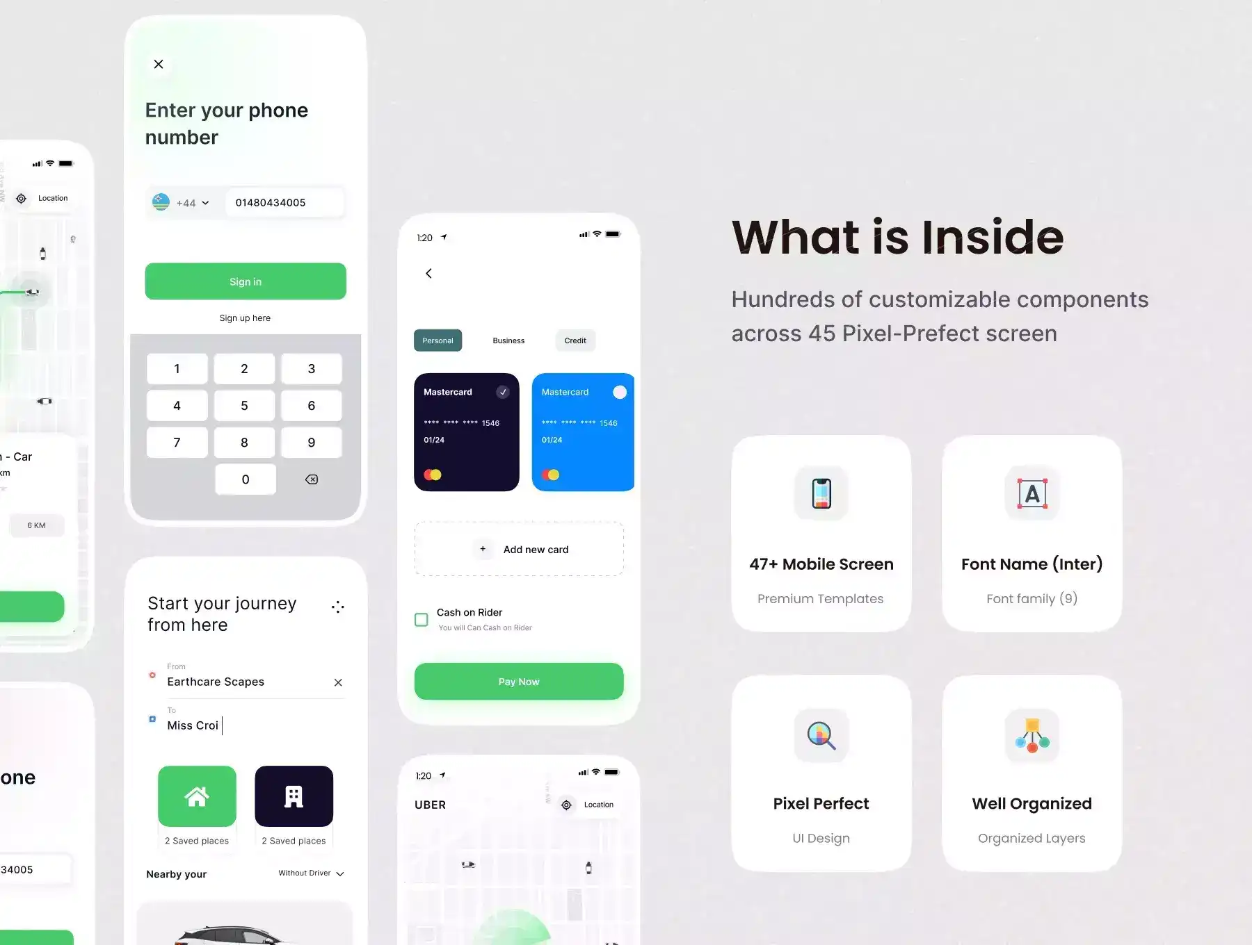 This UI Kit features a renting flow. The first screen shows a map with nearby cars and cards with available types of vehicles. Ride details - time, distance, price - are shown on the second screen.