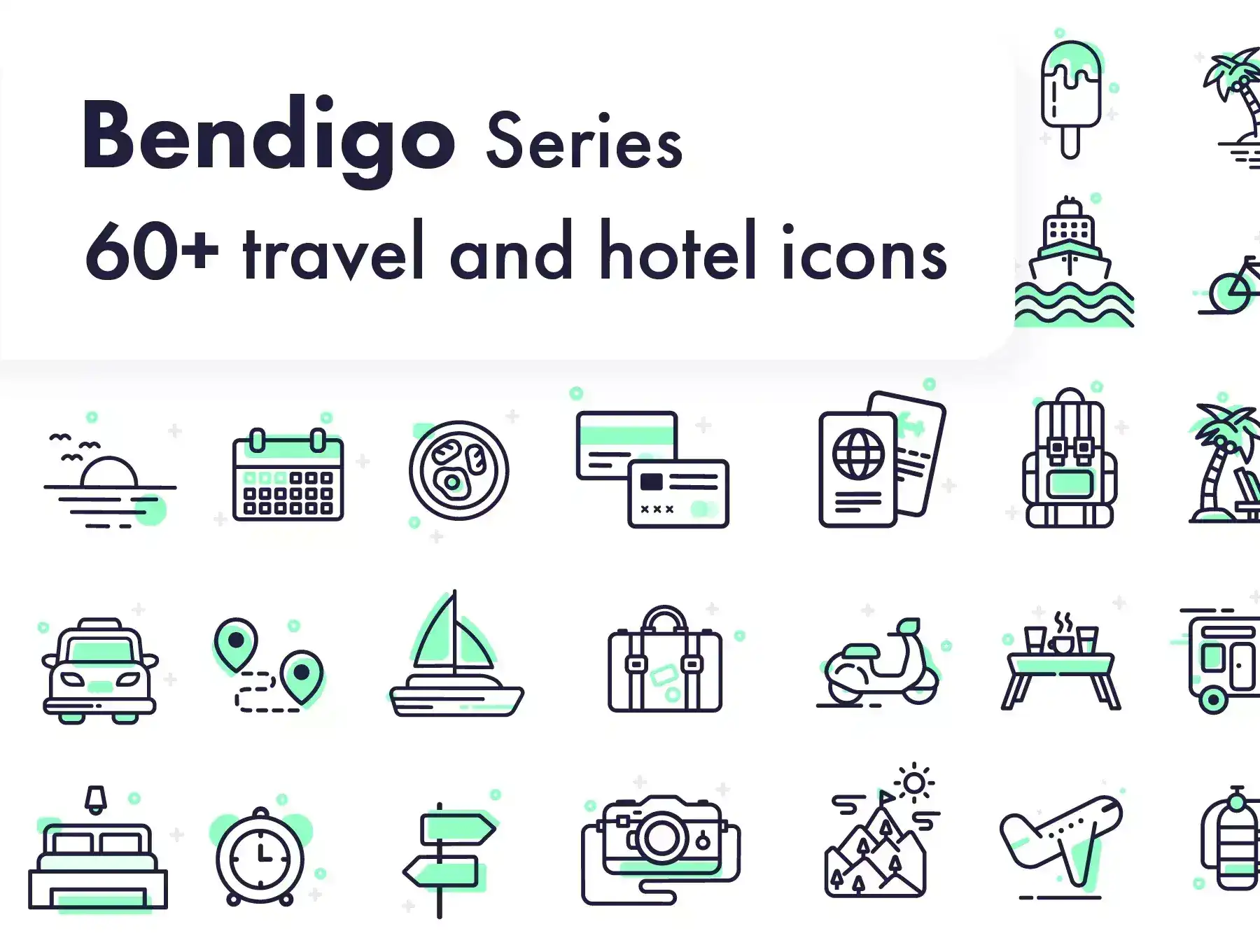 The Bendigo Series Travel&Hotel is made of 61 icons it is appropriate for designing applications and websites with travel themes.