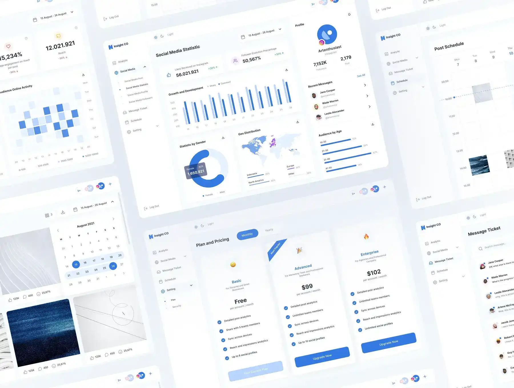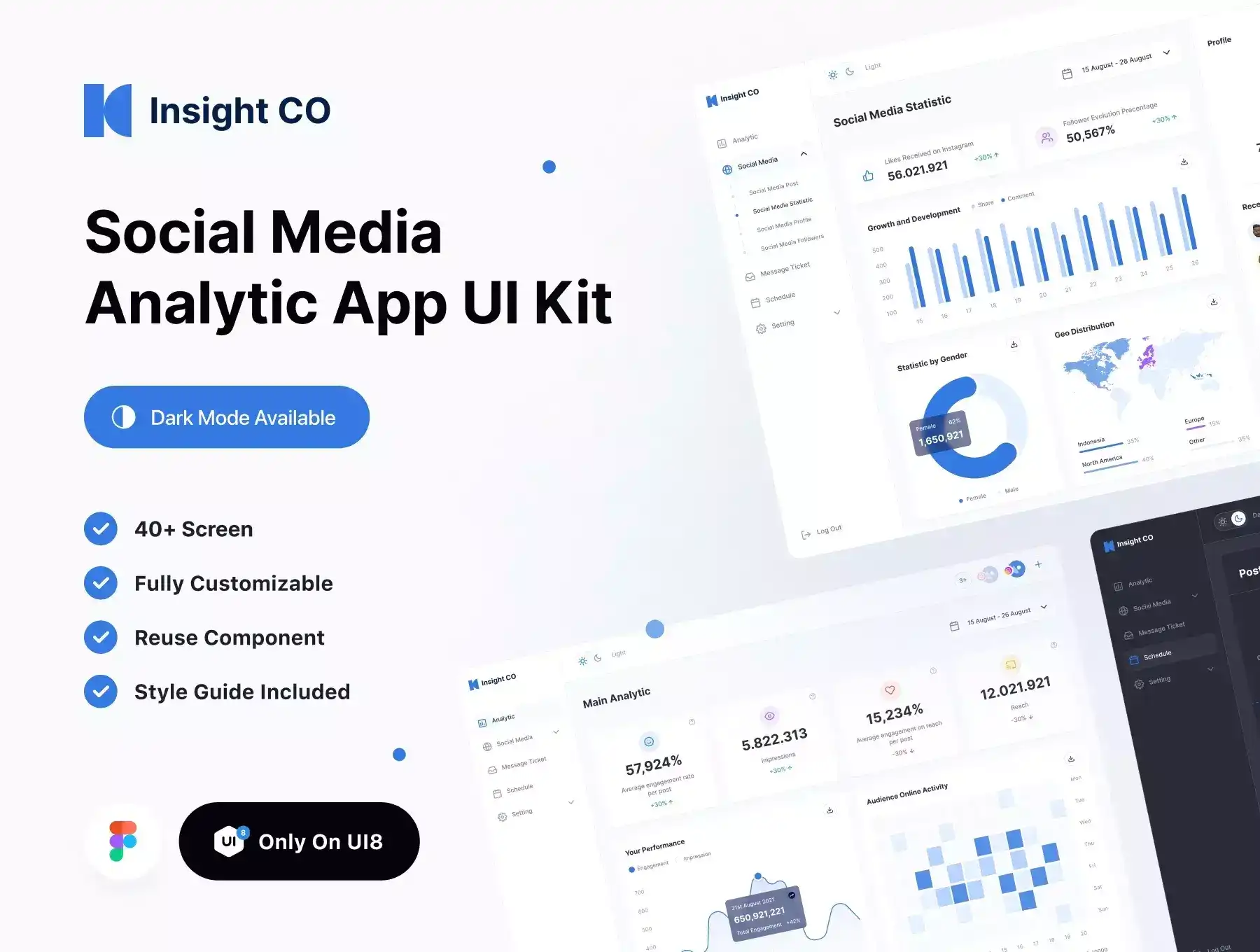 Insight is a Premium Social Media Analytic Dashboard UI Kit consisting of 40+ pixel-perfect screens and easy to use in Figma.