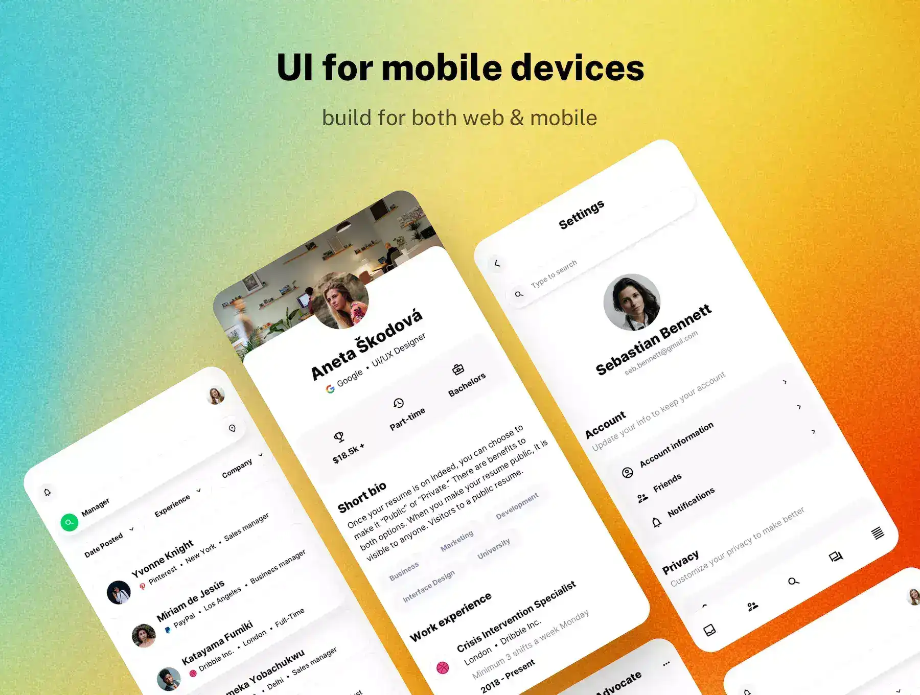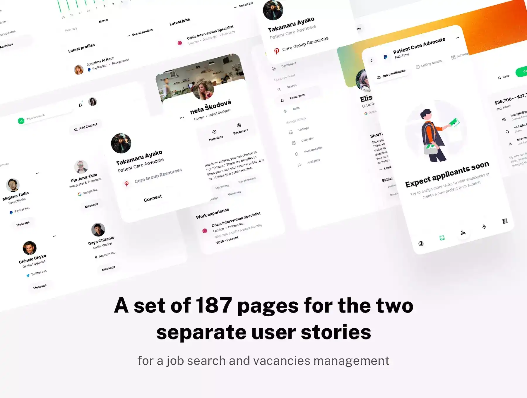 Use a tool of your choice to design a UI faster with our pre-designed symbols gallery, layers and fonts styles. This UI template is perfect for Job Boards, Employees search or any other HR management apps.