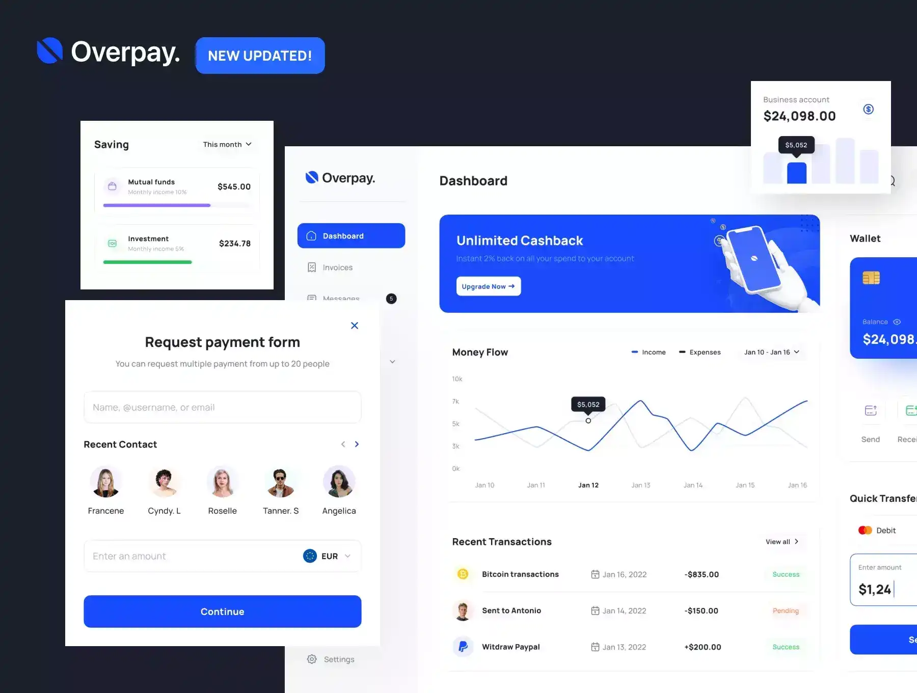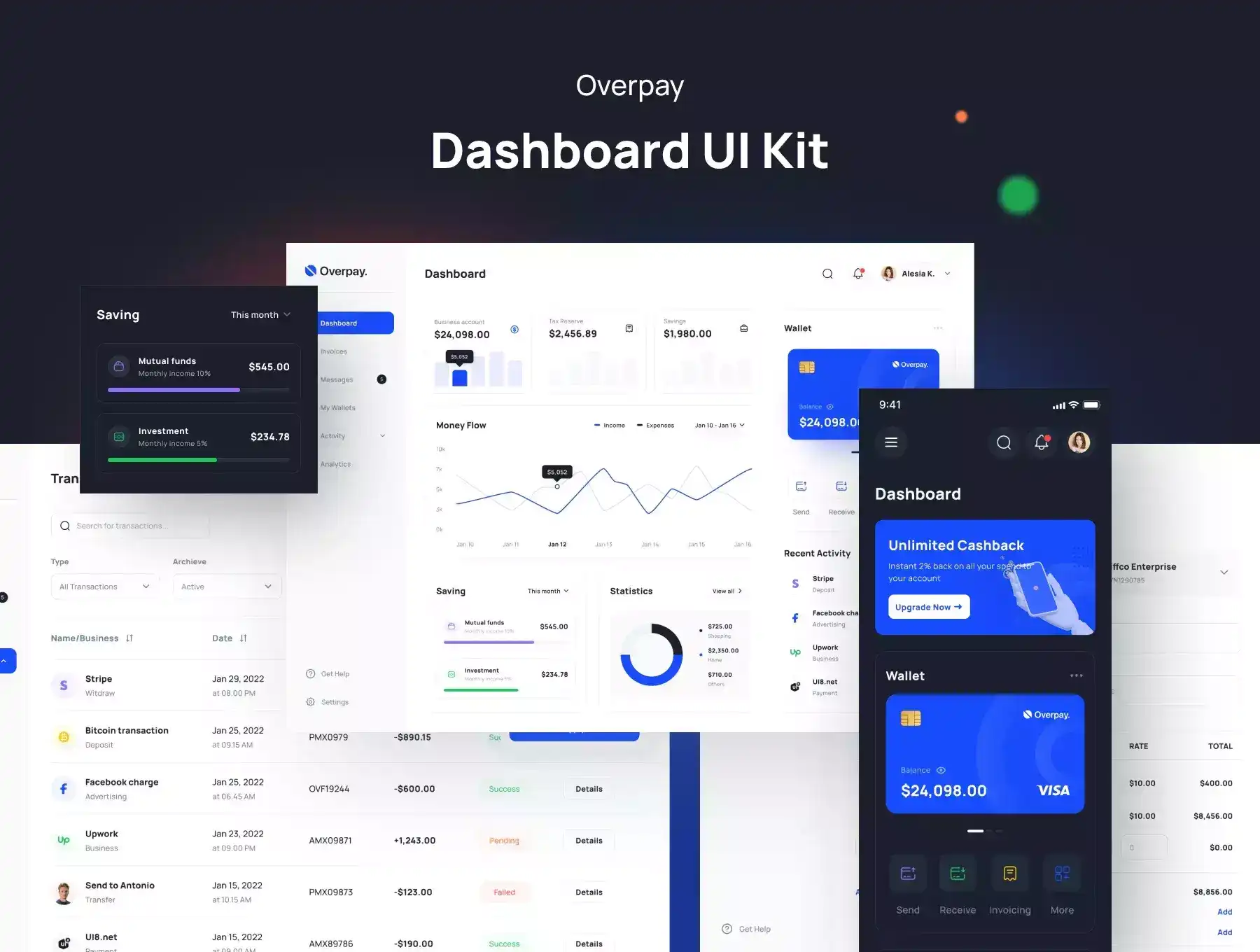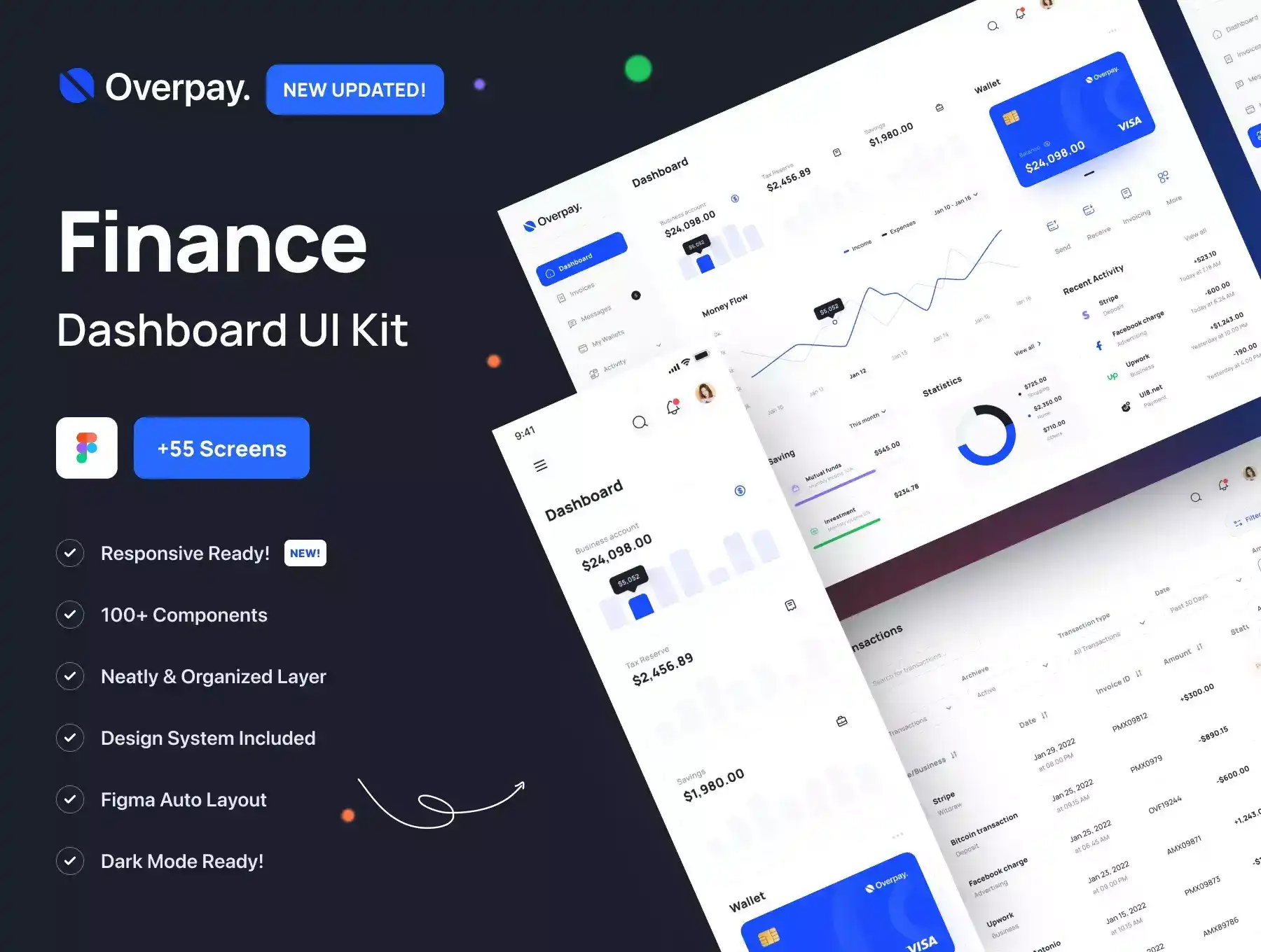 Overpay is a Premium and High-Quality Finance Dashboard UI Kit with 55+ high-quality screens and easy to use in Figma. New update available Responsive Design. Available in Light & Dark theme.