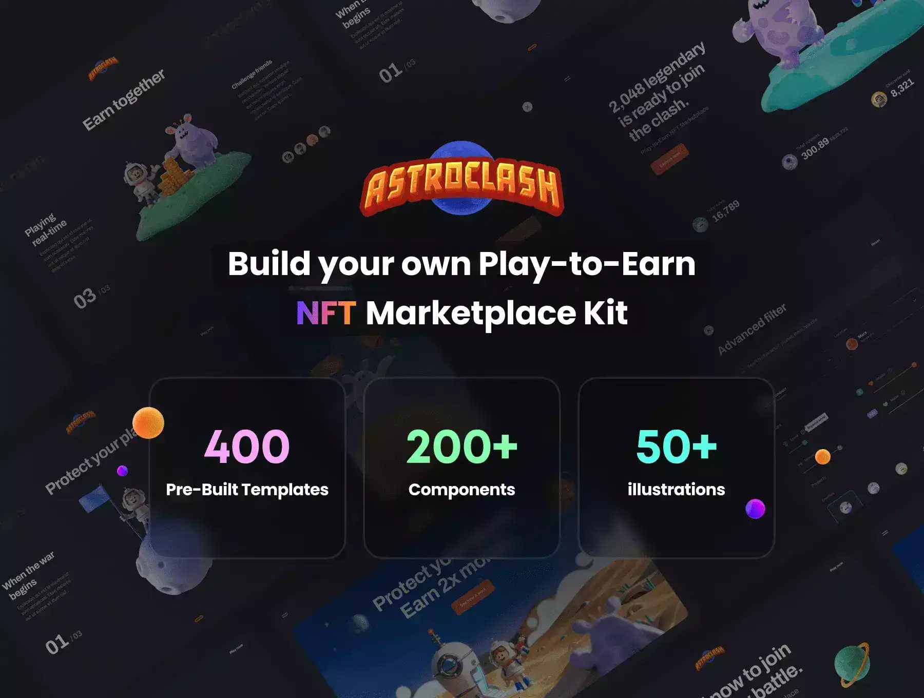 Meet AstroClash, a fully-featured Play-to-Earn NFT Marketplace Kit, including exclusive design files all editable in Figma plus a pack of custom, beautiful 3D illustrations.