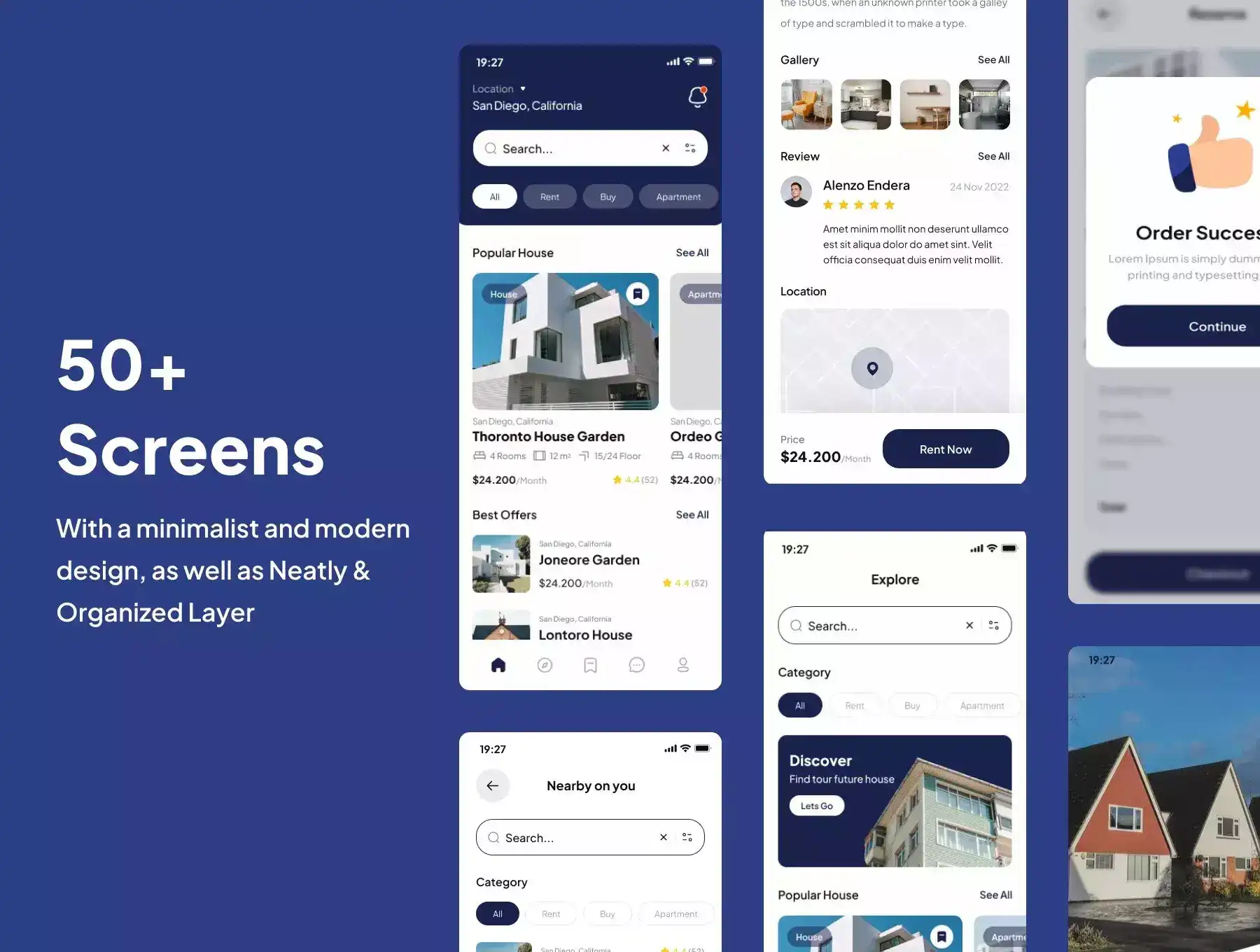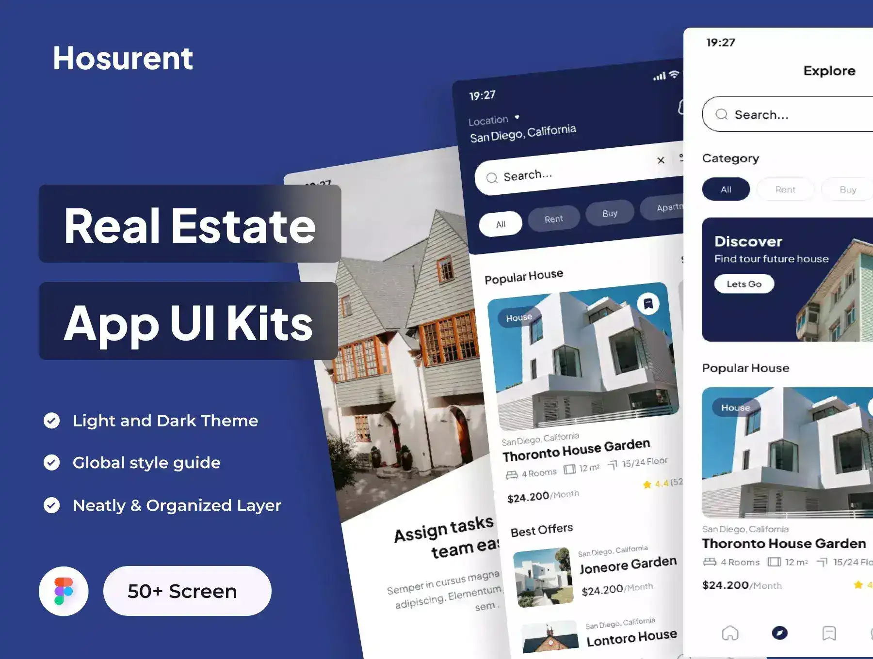 Hosurent a Minimaslist design UI Kits for Real Estate with 50+ screens.