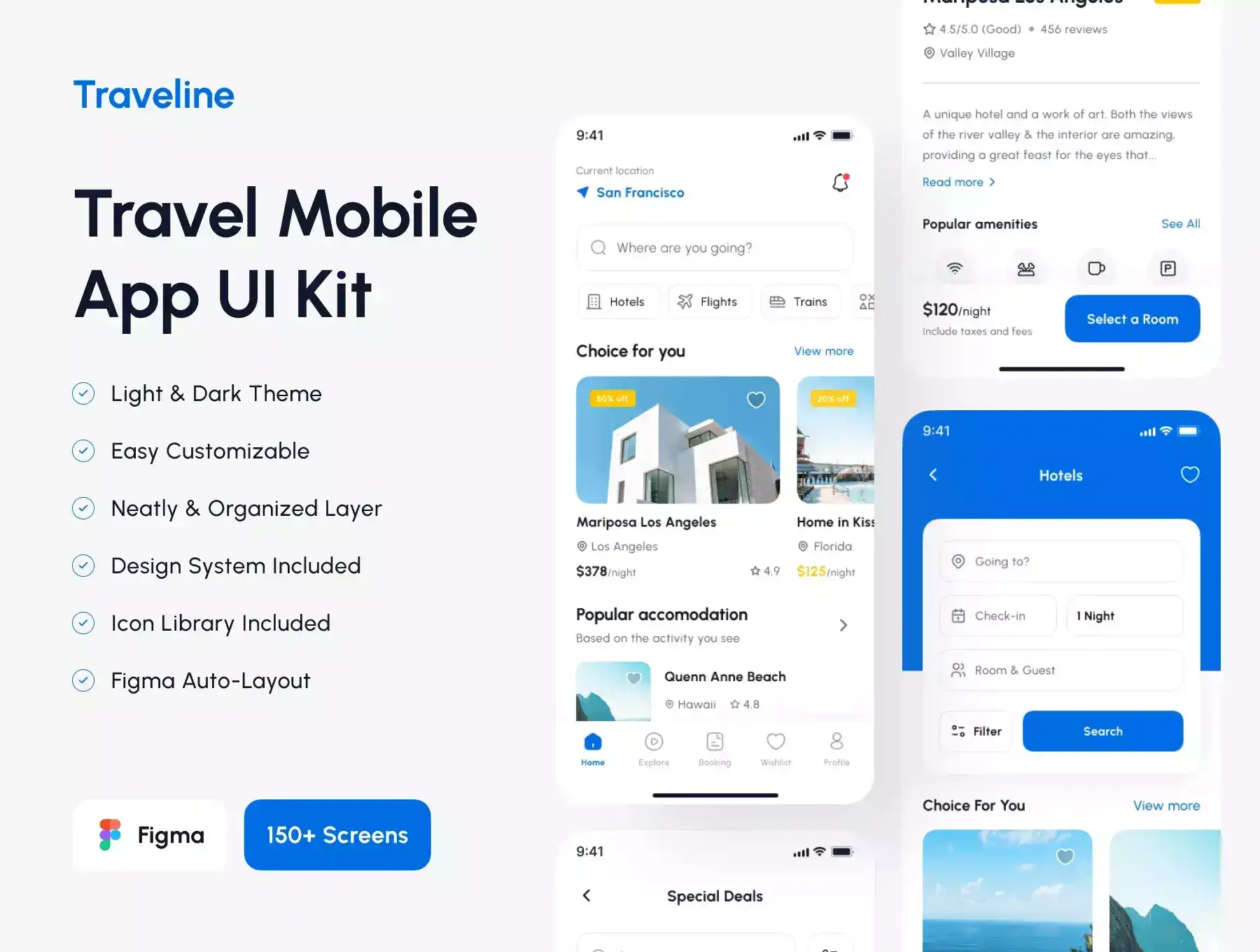 Traveline is a Travel and Lifestyle App UI Kit with detailed high-quality screens and easy to use in Figma. We designed 150+ Light Theme & 150+ Dark Theme mobile app design screens.