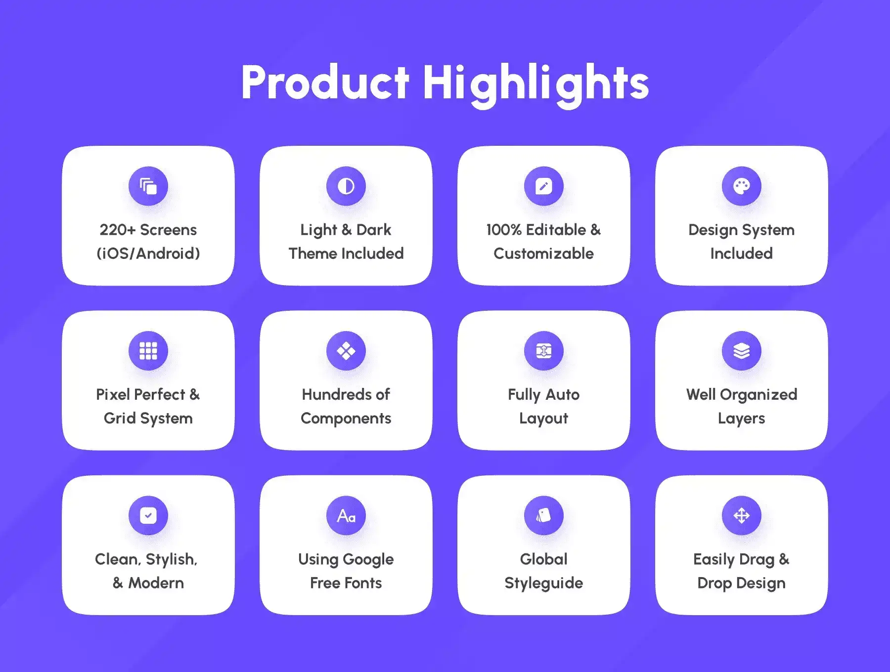 Quizzo support for iOS/Android (design system included) and 224 screens which is 100% editable & customizable. Designs are available in Figma. In addition, the design is also equipped with a version of Light & Dark Theme.