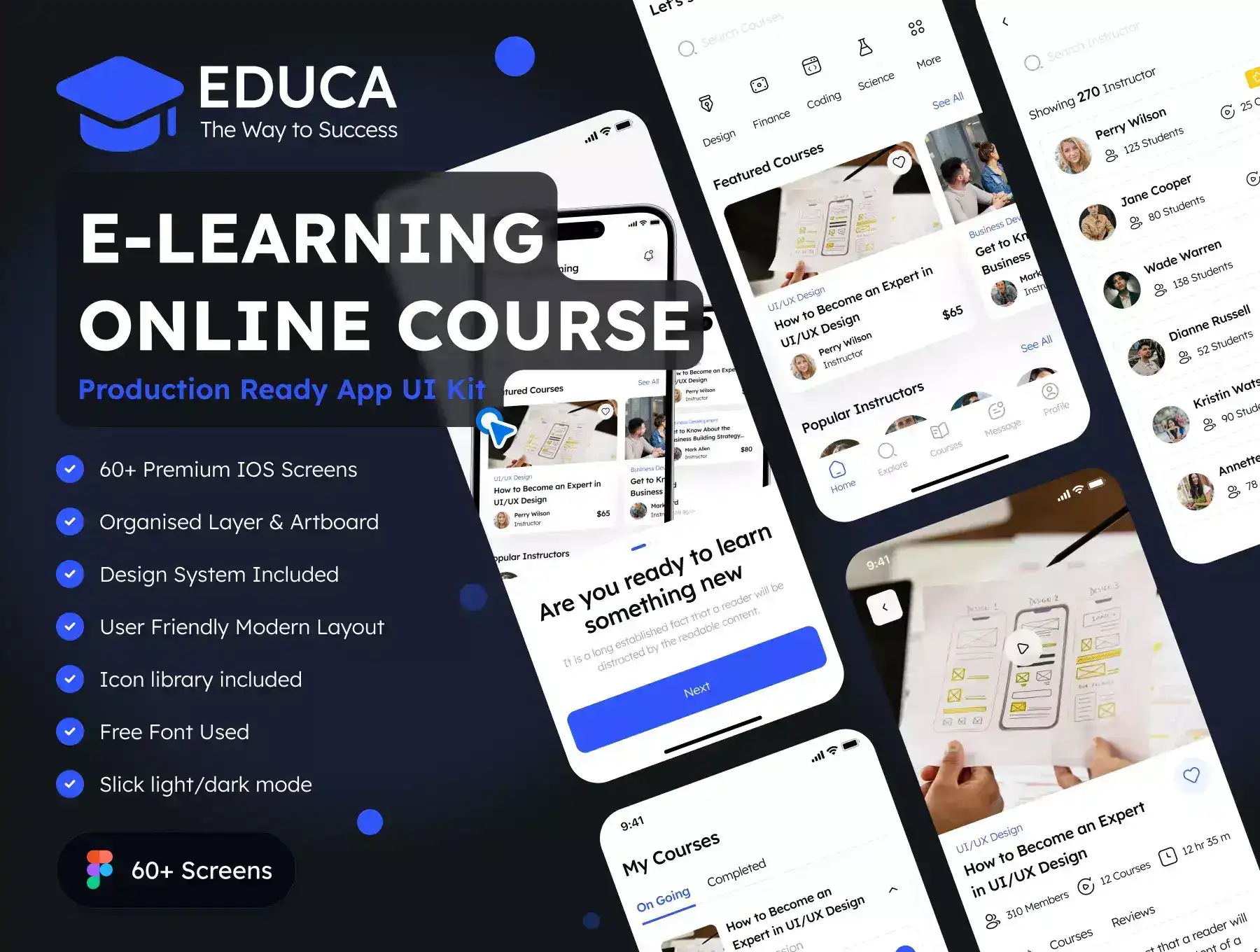 Introducing our E-Learning Online Course App UI Kit, a comprehensive set of over 60+ pixel-perfect screens designed for easy use in Figma. With this kit, you can easily customize the design to your liking, taking advantage of all of Figma's features such as global color, font styles, dynamic components, and variants. Additionally, the UI kit is available in both Light and Dark themes, providing flexibility to suit your specific needs.