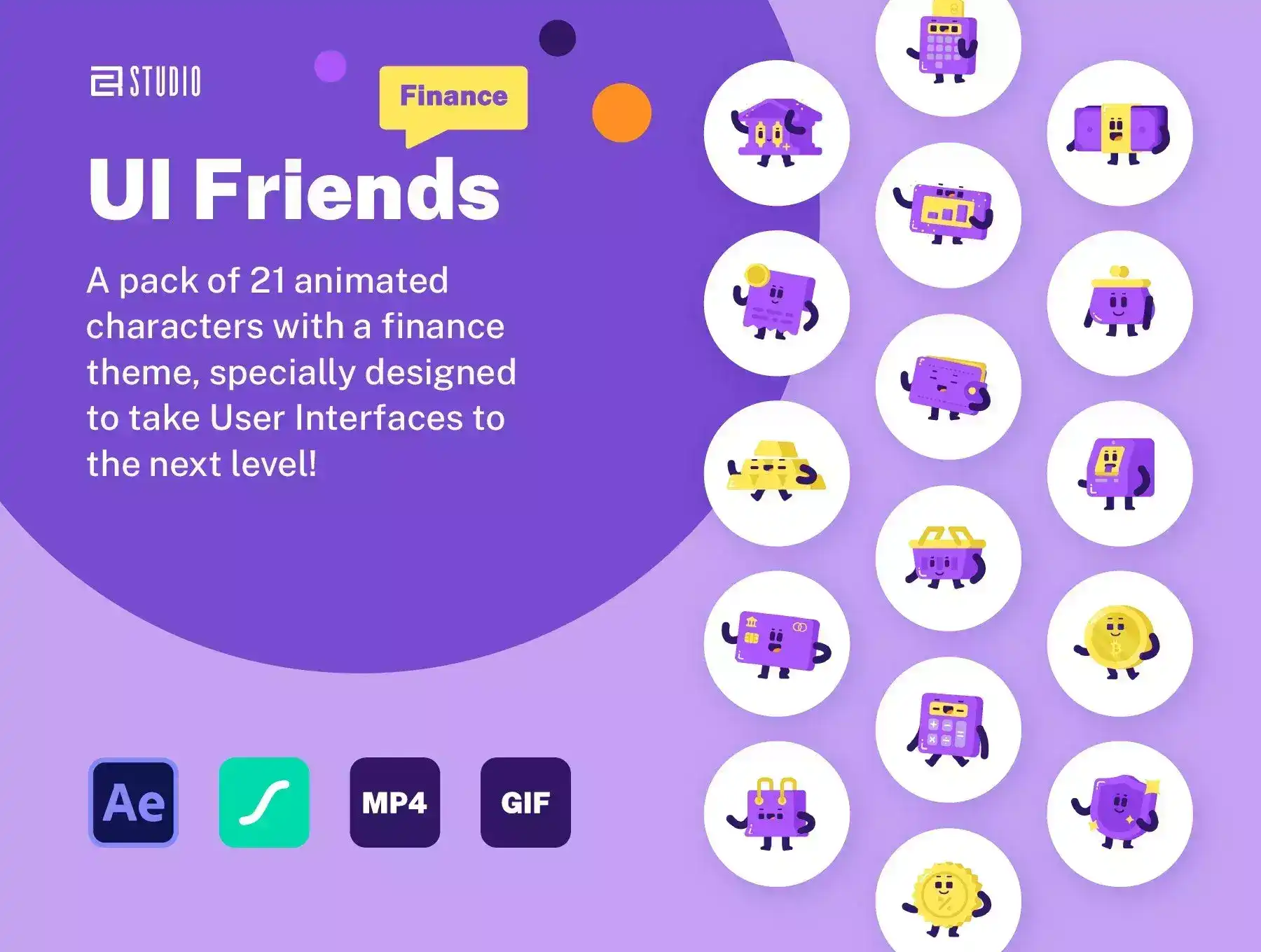 A pack of 21 animated characters with a finance theme, specially designed to take User Interfaces to the next level! The collection of characters adds a touch of personality and interactivity to any digital creation. Whether you are creating a website, app or other type of User Interface, these animated characters bring your designs to life. The different file types that you'll get in this package are: Lottie, MP4, GIF and After Effects.