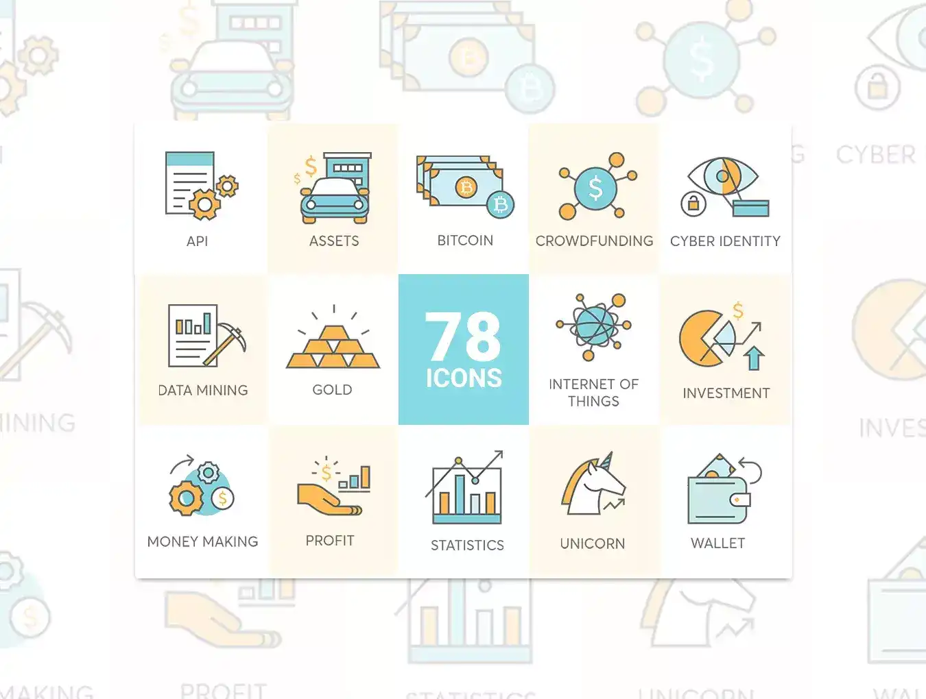 A collection of 78 Finance Icons - This set is perfect for your Finance or Fintech startup, but of course there are many other uses! Great for financial blogs, bitcoin news site, crowdfunding apps & so much more! Concepts include SAAS, Internet of Things, Unicorn, Bitcoin, Cryptocurrency, Blockchain, API, Wallet, Mobile Banking, Asymmetric keys, Datamining, Big Data, etc.