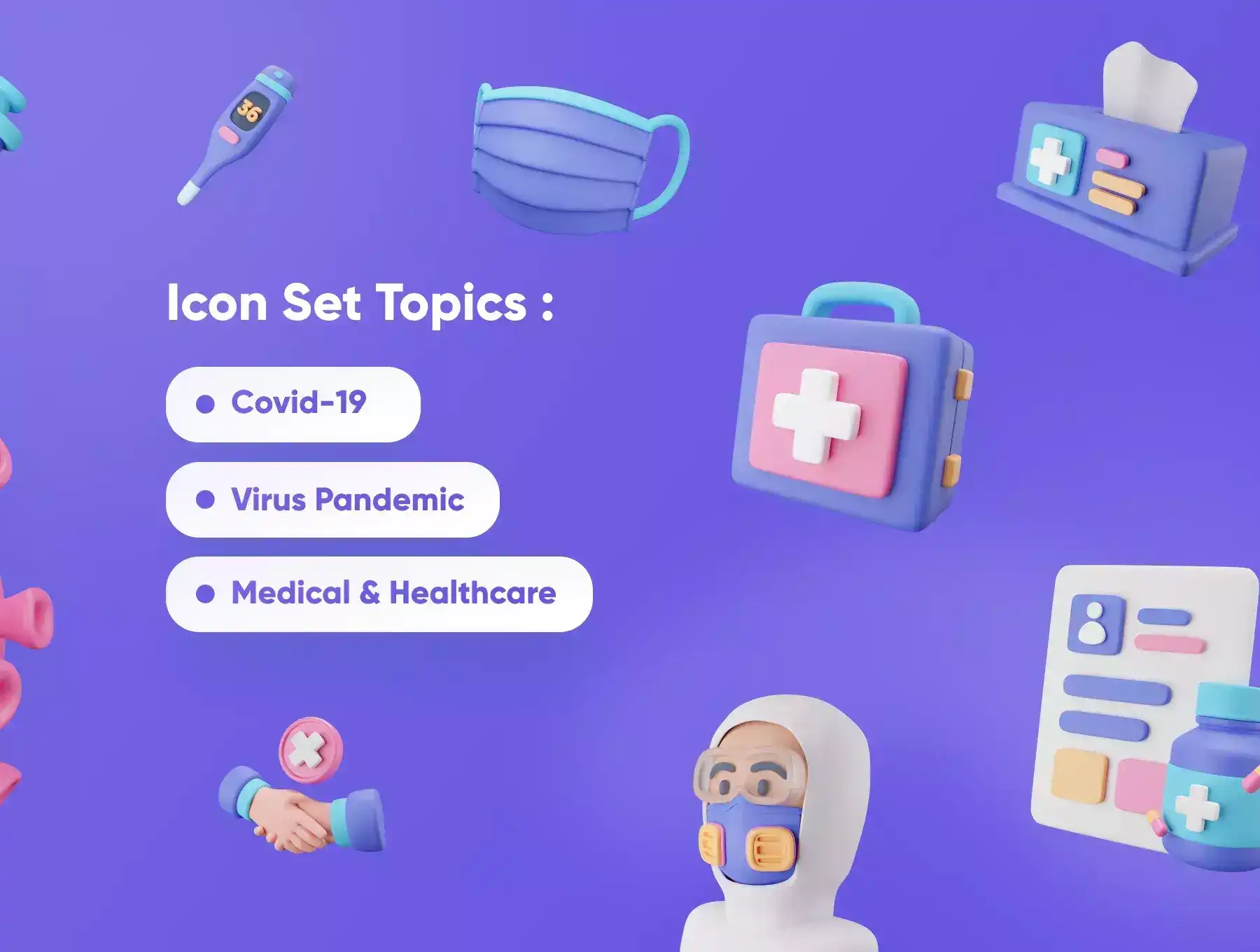 Covidly is a pack of custom 3D icons suitable for Healthcare (Covid-19) niche. Make your next product and project more stunning with 3D Icons.