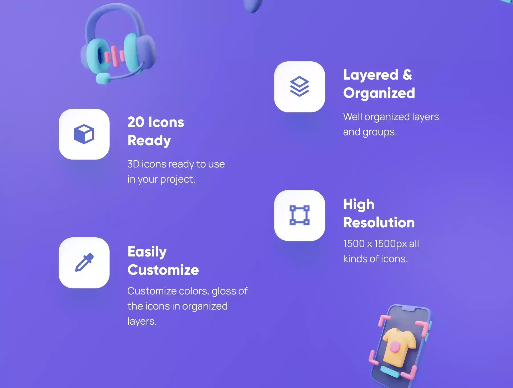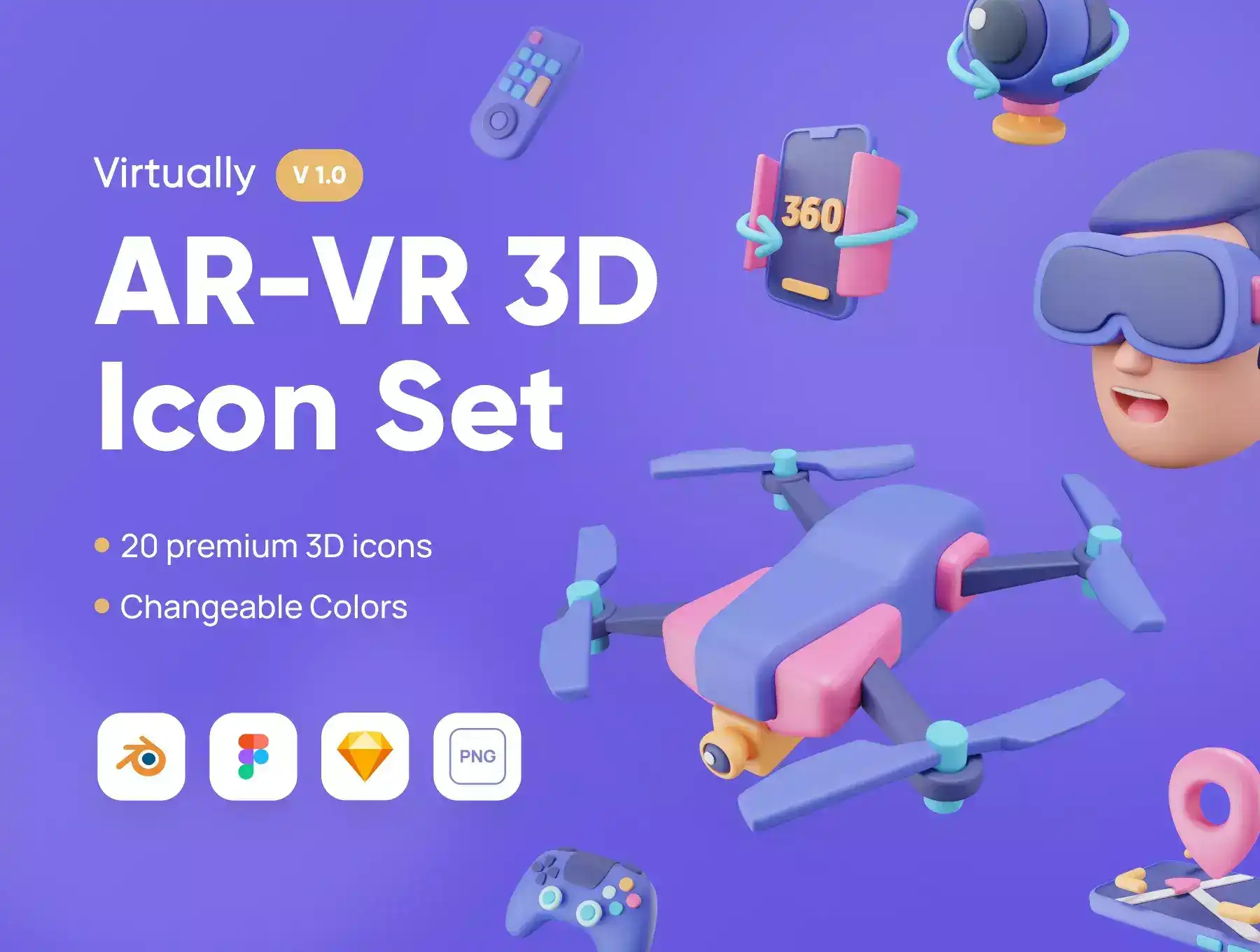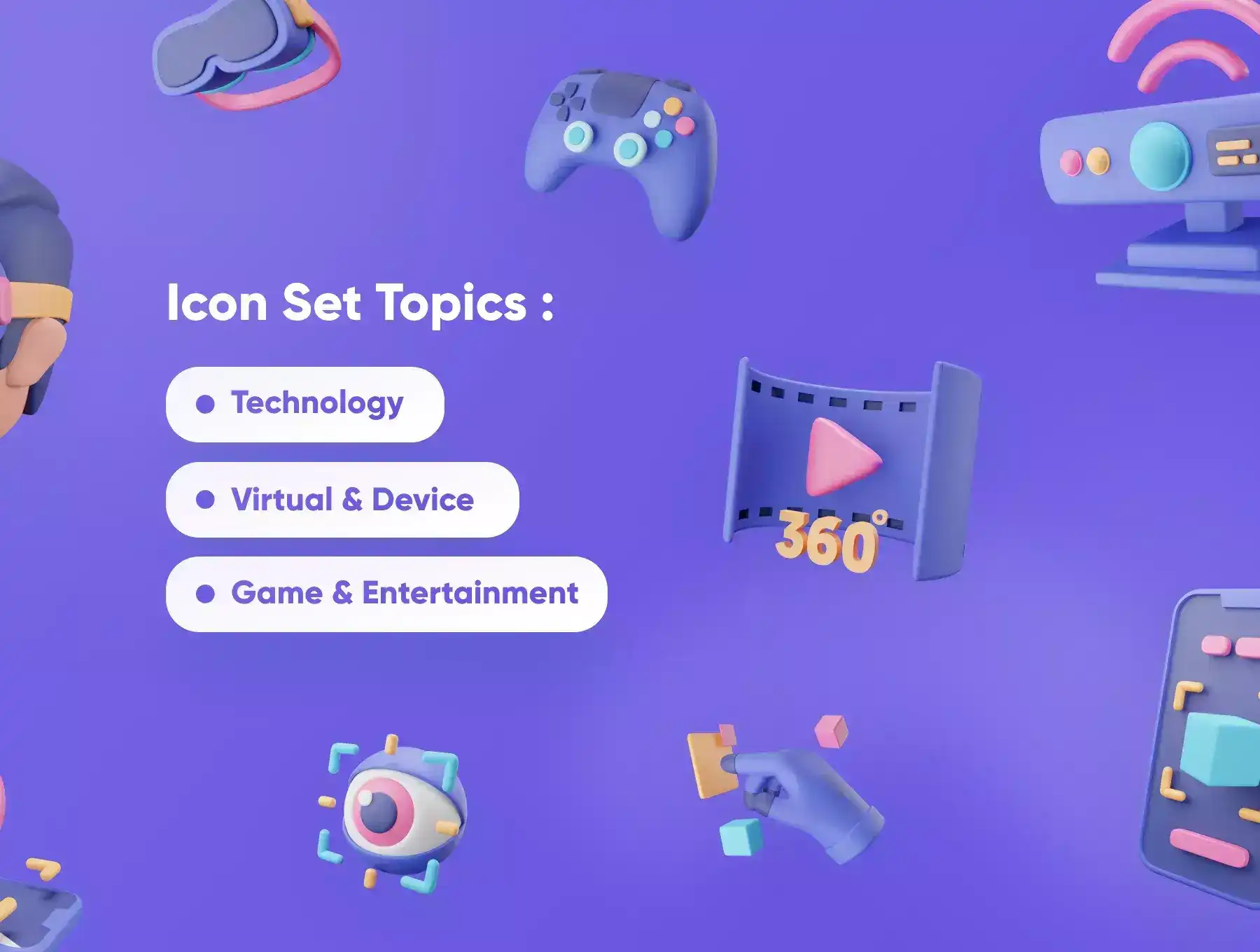 Virtually is a pack of custom 3D icons suitable for VR-AR and Technology. Make your next product and project more stunning with 3D Icons.