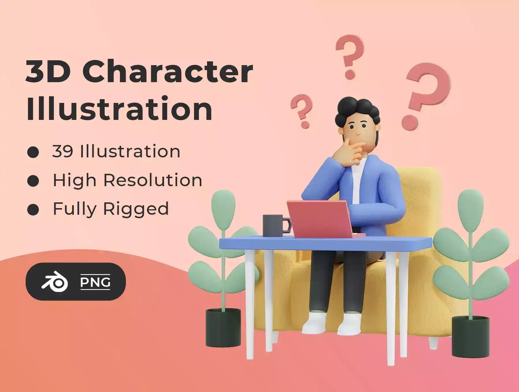 3D Character illustration packs are made for various purposes such as your presentations, posts, apps and websites to be attractive. You will get 39 high quality character illustrations (3000x3000 PNG) as well as a blender file. You can change the character's pose and color at will.