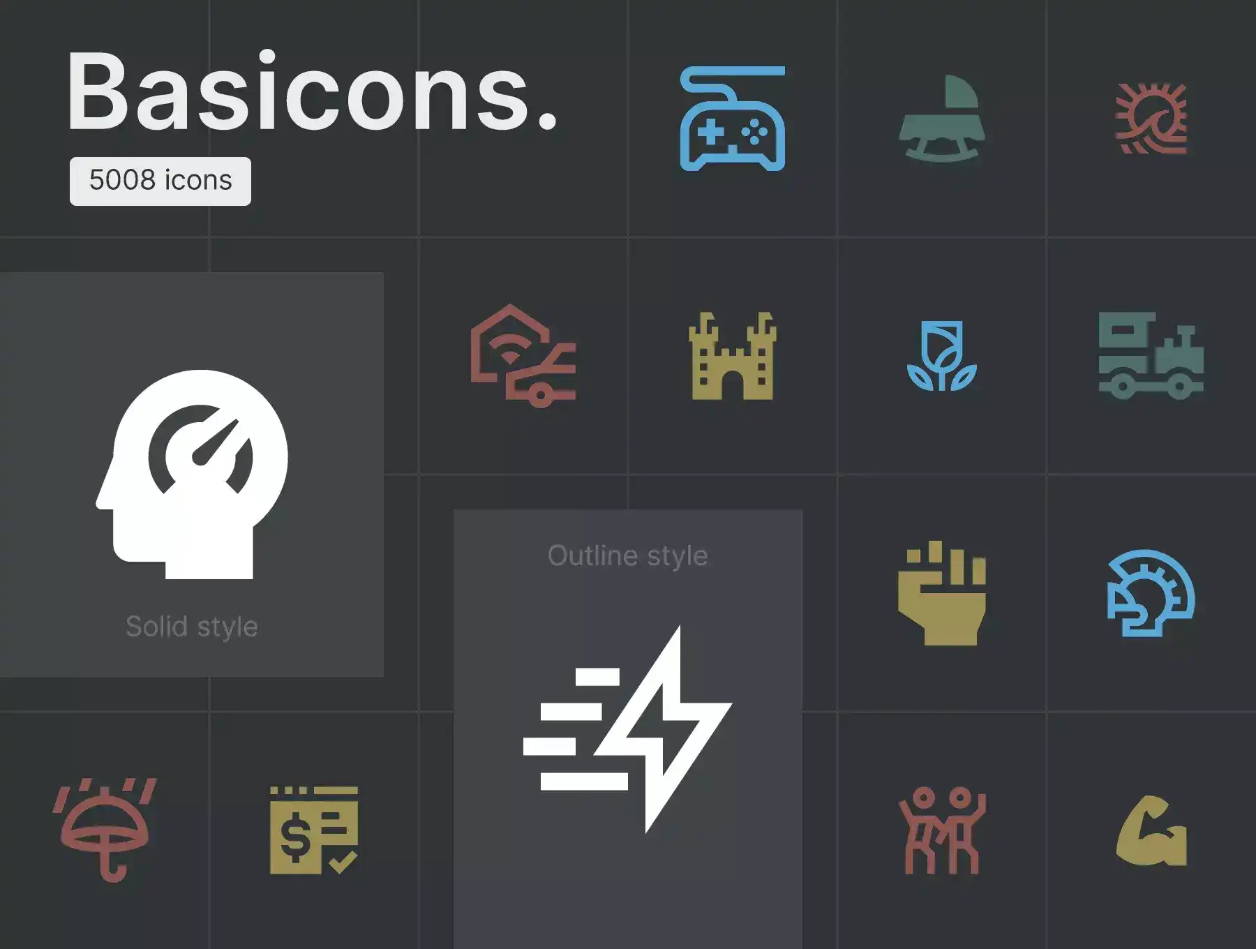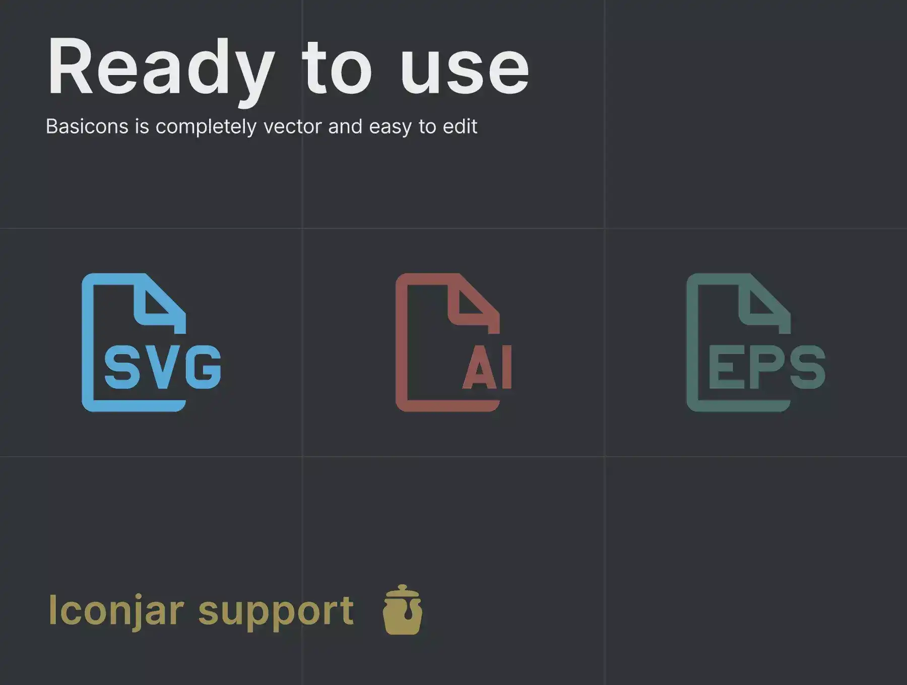 Basicons is a multipurpose collection for professional use by designers. It's a perfect way to speed up and enhance your workflow. Icons are fully customizable and infinitely scalable. All collections are separated into individual SVG, EPS and AI files.