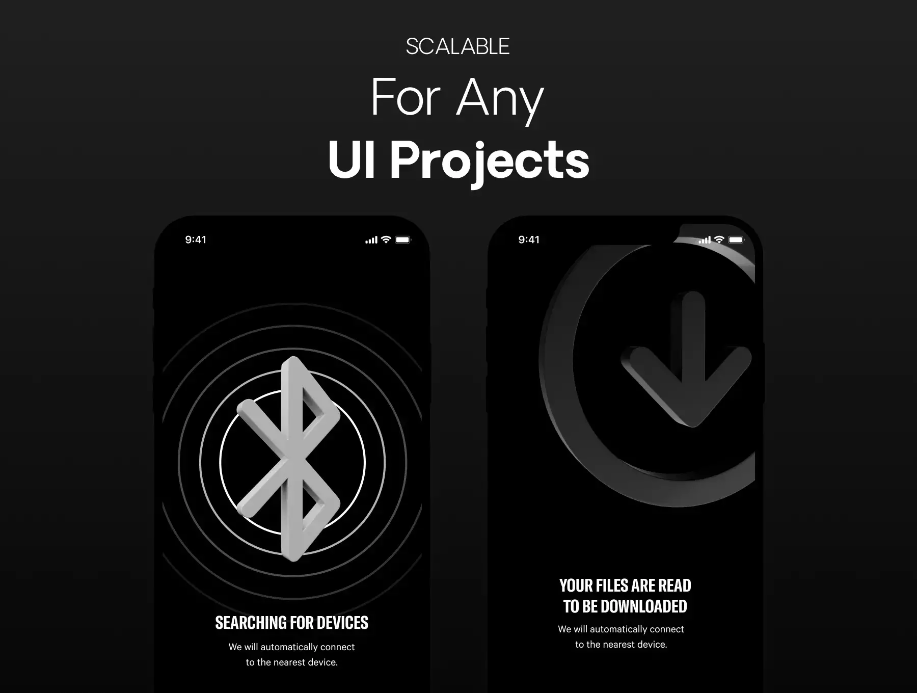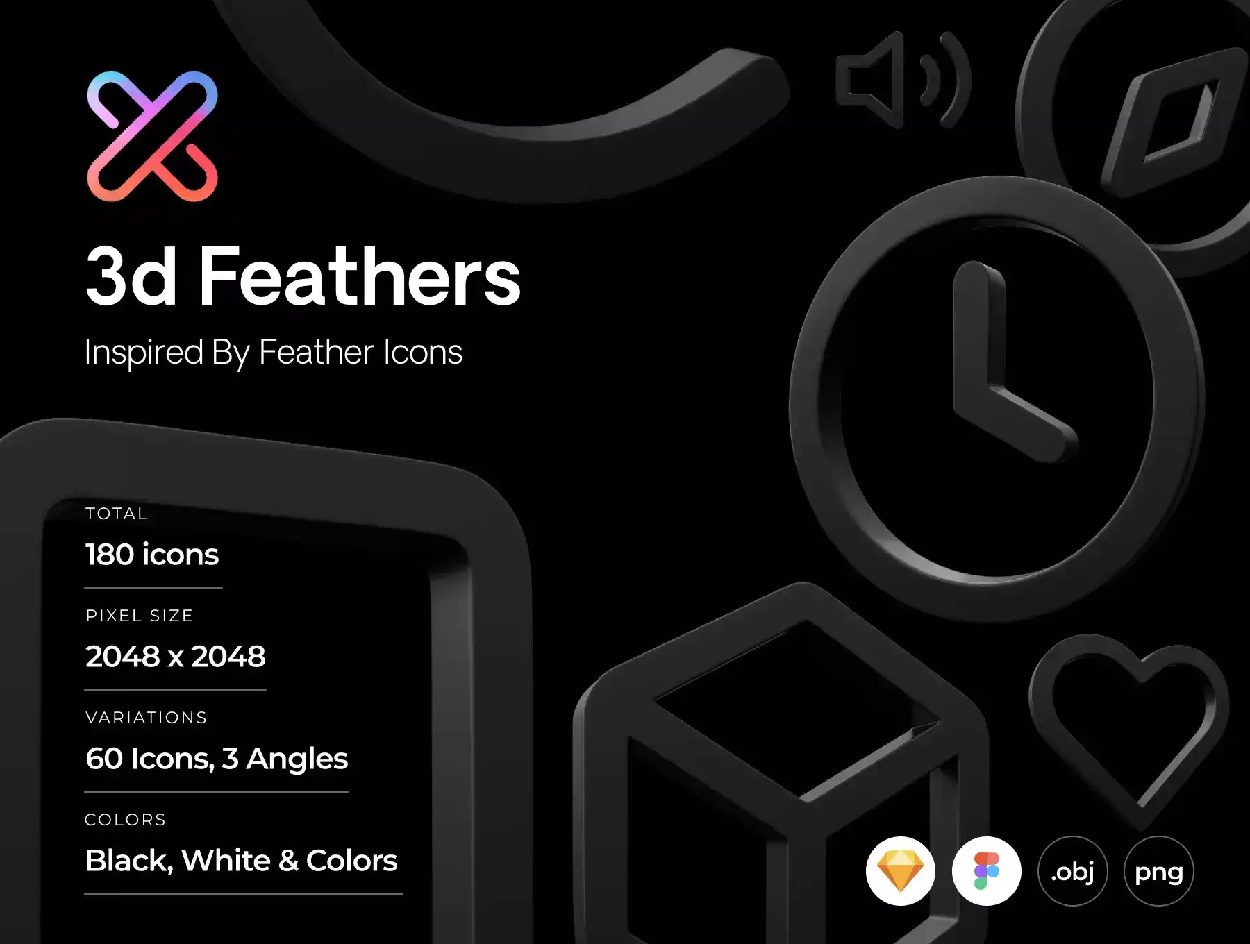 A unique set of 3D feather icons in black and white, with the ability to change colors. These icons are perfect for any UI project or presentation.