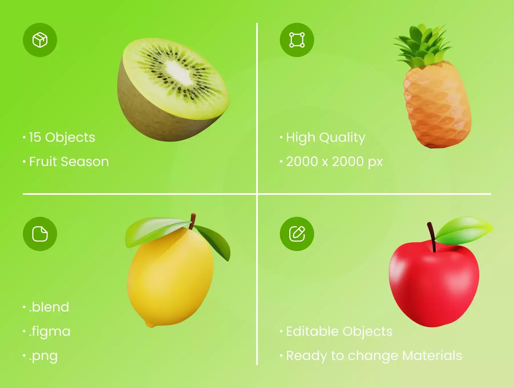There are 15 3D Fruit illustrations to make your landingpage and mobile apps look stunning.