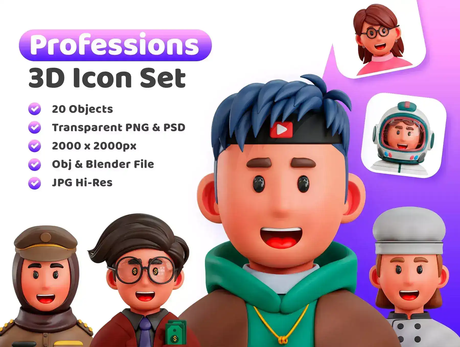 🏆 This is a Professions pack of 3d Icon for design need, animation, apps, Ui Design, web design, Presentation, flyer or poster, social media advertising, content creator, and other.