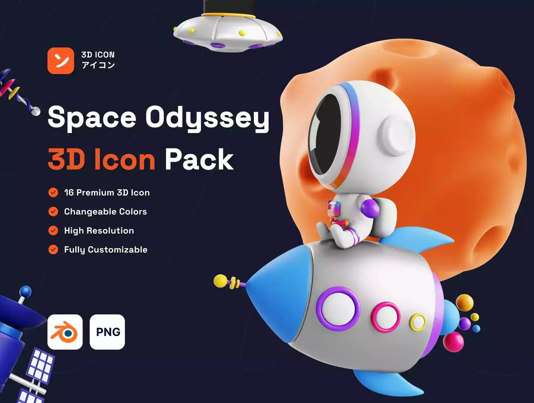 Commercial space odyssey is a custom 3D icon pack with a space theme suitable for any product. This pack will perfectly complement the design of your app, presentation, website, etc. This kit includes icons like Astronauts, Planets, aliens, Solar systems, Spaceships, and more. Create stunning and unique projects with these hand-crafted icons, easy to edit in Blender.
