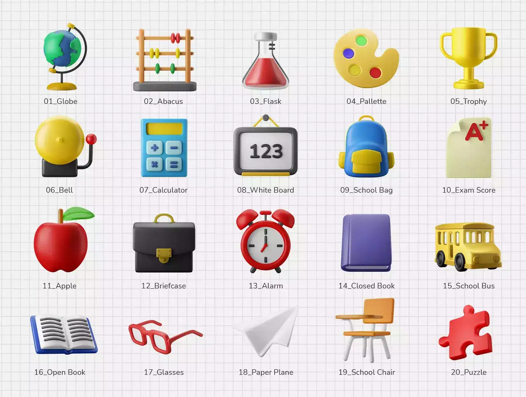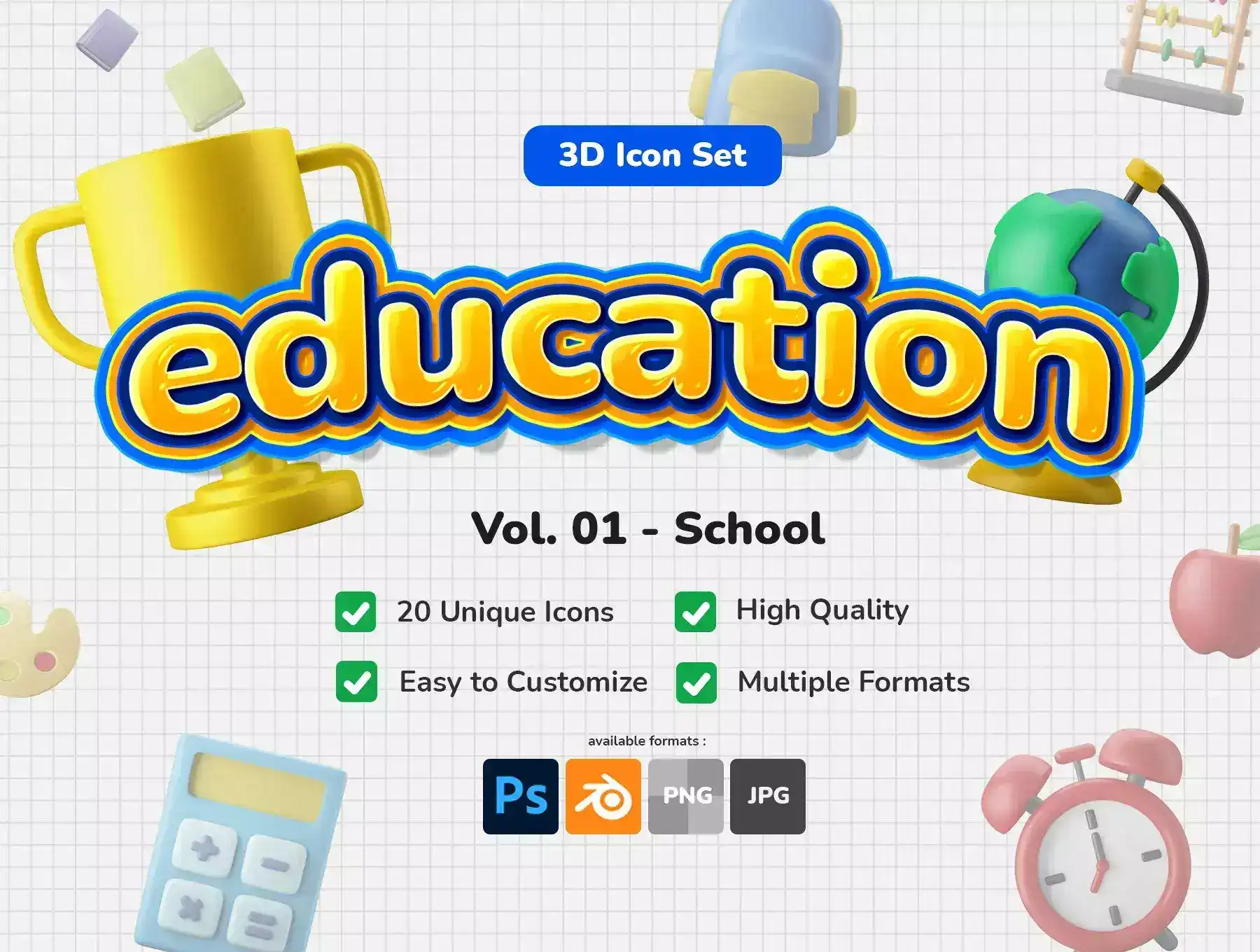 Make your education school theme project stand out, cute and unique with this 3d icon illustration set. Contains 20 high quality and well made education elementary school theme 3d icons, available in Editable Photoshop PSD files, 3D Blender, PNG Transparent, and JPG with white background.