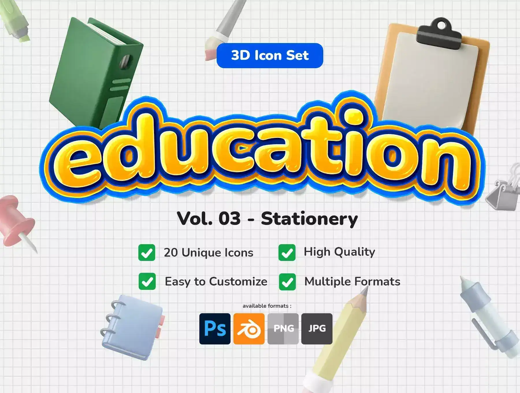 Design and make your education theme project stand out and unique with this 3d icon illustration set. Contains 20 high quality school supply / stationery theme 3d icons, available in Editable Photoshop PSD Files, 3D Blender, PNG Transparent, and JPG White Background.