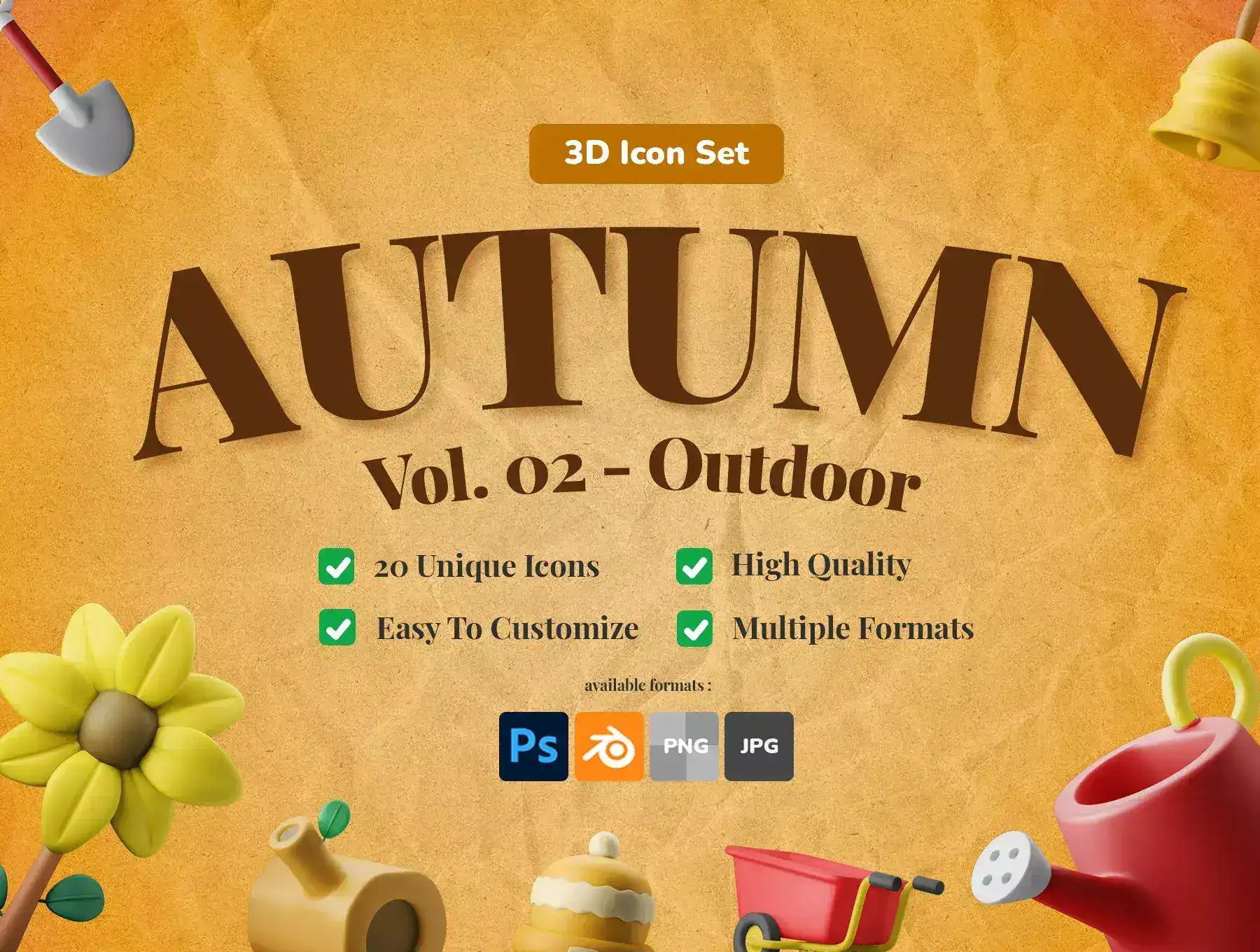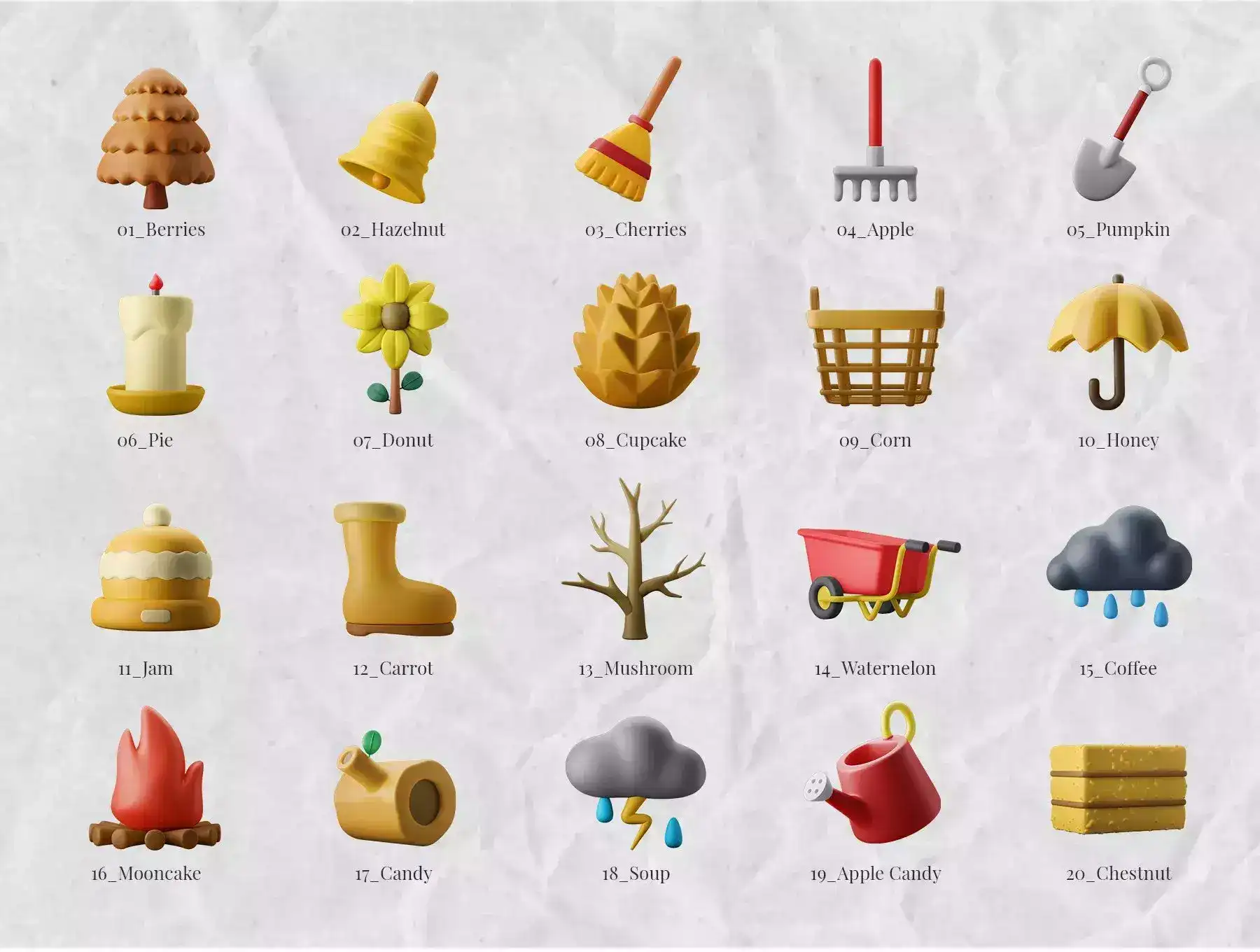 Design your autumn outdoor theme project and make it stand out from the rest with this 3d icon illustration set. You'll get 20 high quality and well made autumn outdoor theme 3d icons, available in Editable Photoshop Files, 3D Blender, PNG Transparent, and JPG White Background.