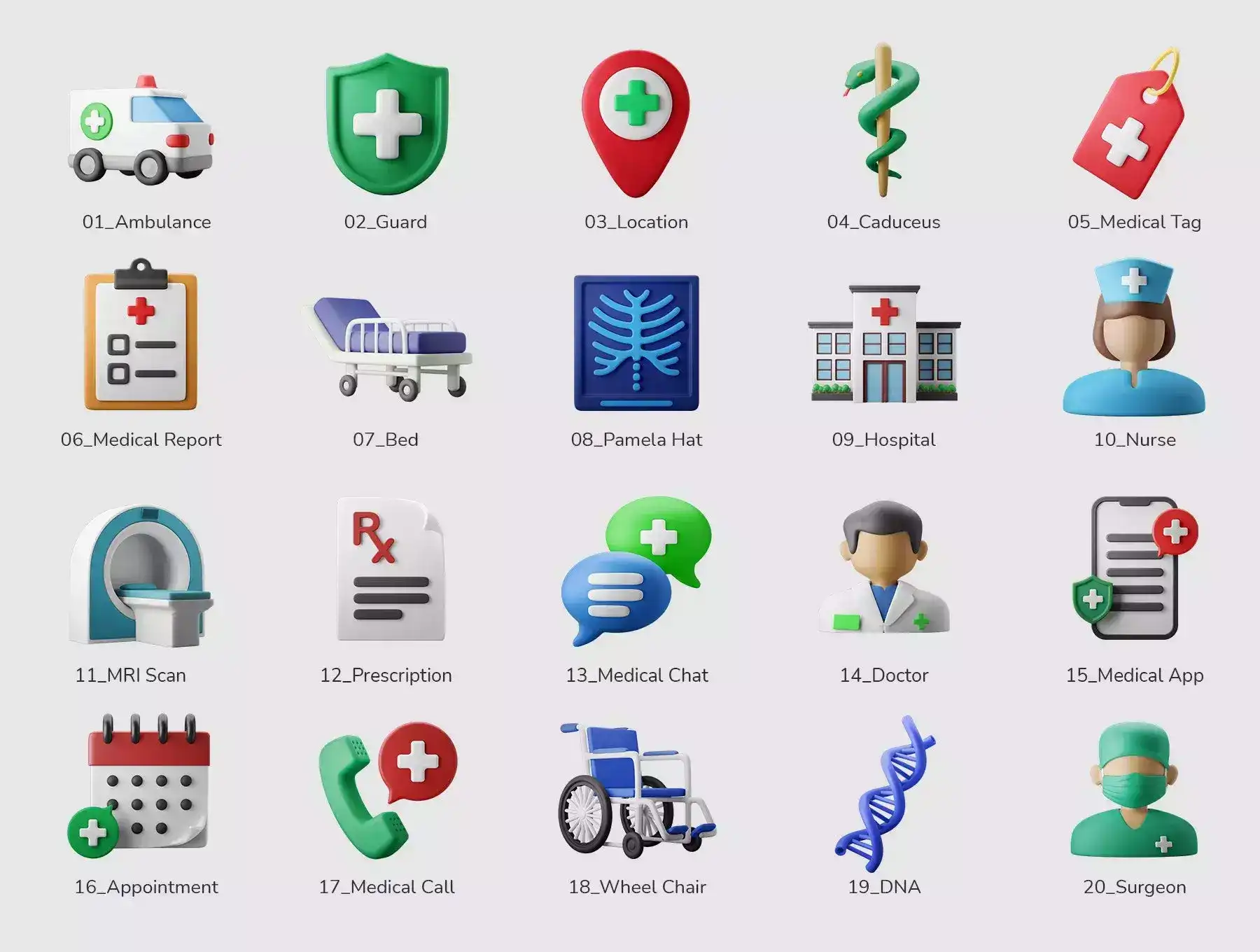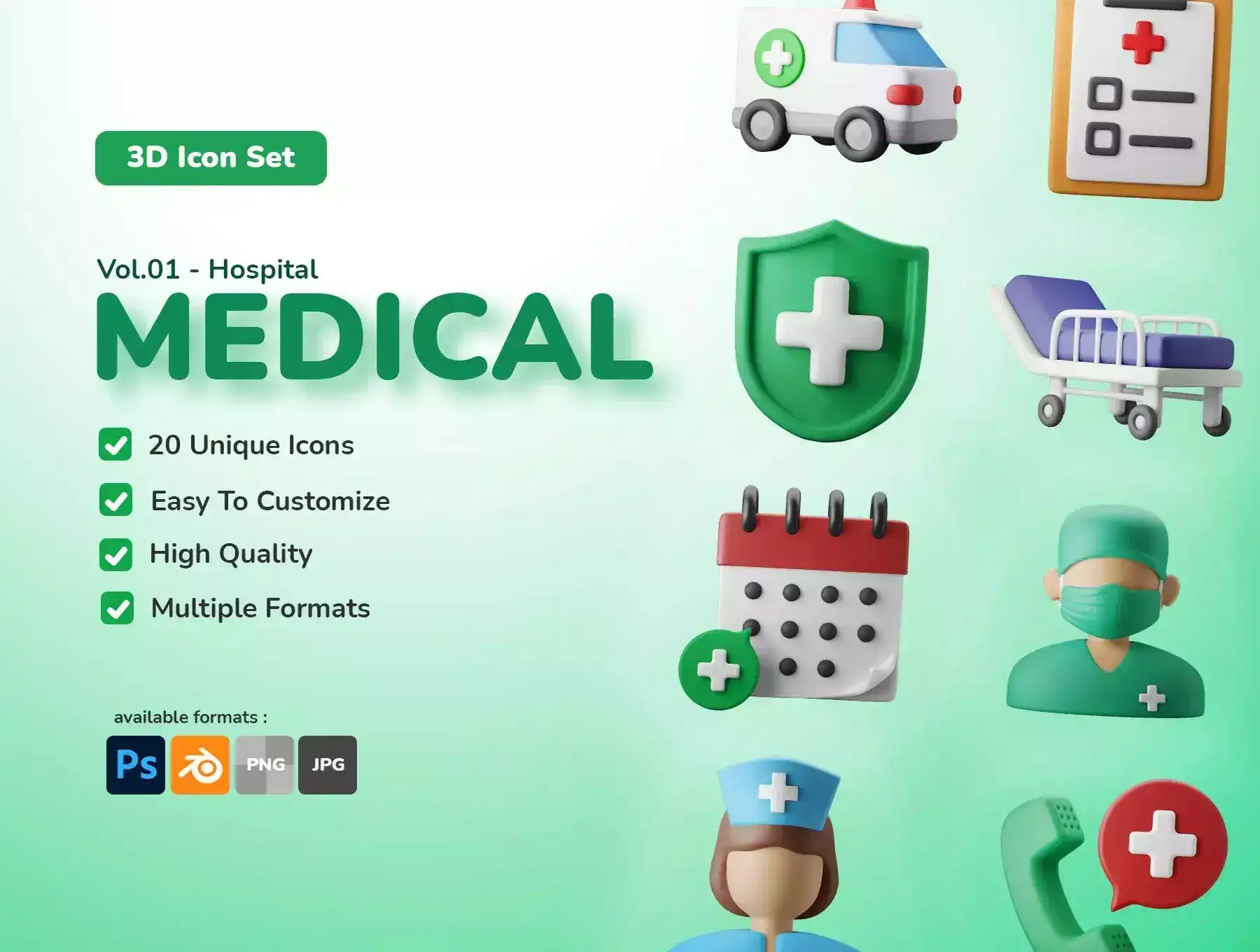 Design your medical theme project and make them stand out and unique with this 3d icon illustration set. You'll get 20 high quality and well made medical hospital healthcare theme 3d icons, available in 4 formats, Editable Photoshop Files, 3D Blender, PNG Transparent, and JPG White Background.