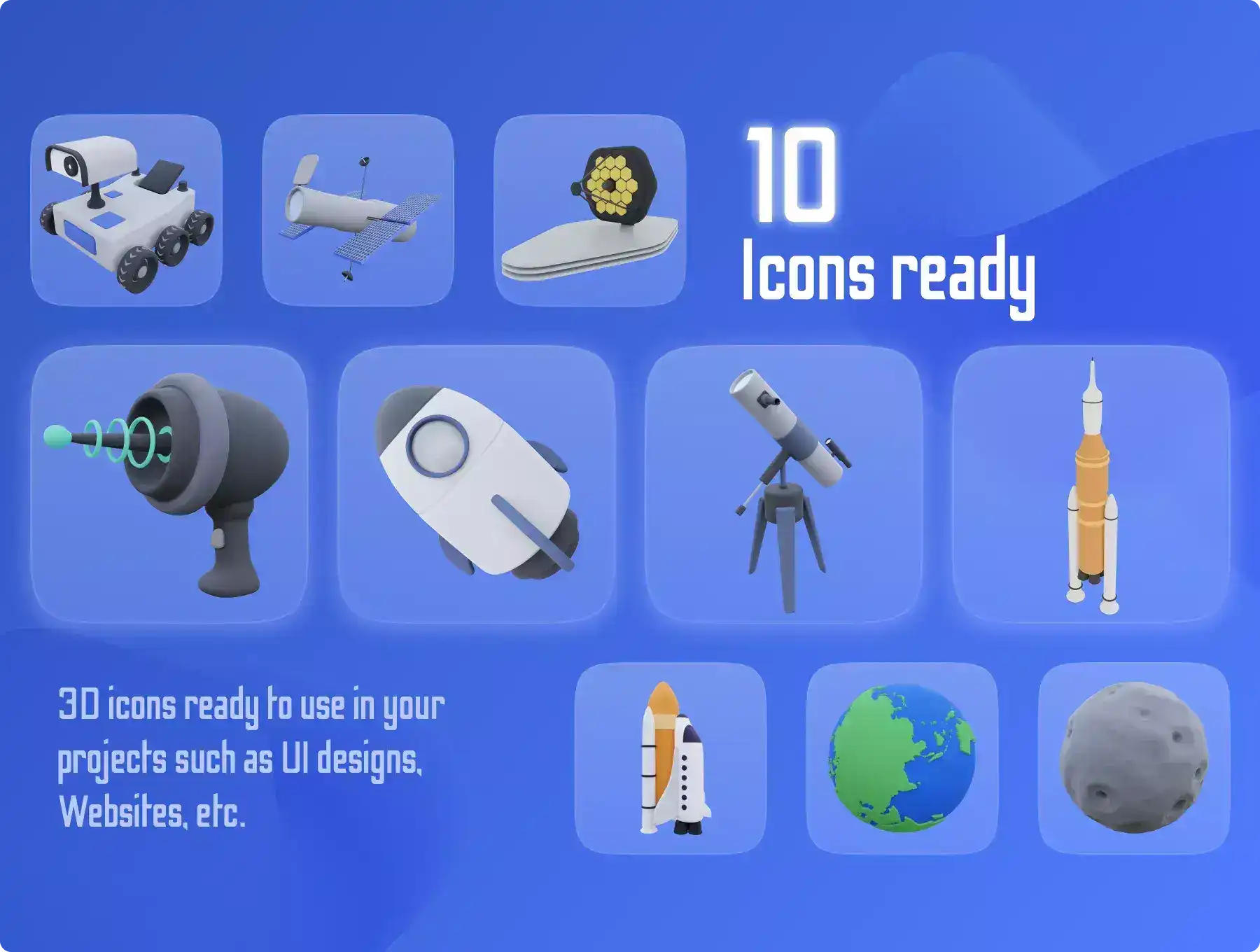 This pack includes icons of : Nasa Artemis, Nasa Space Shuttle, Alien Weapon, Rover, Spaceship, Telescope, Hubble Satellite, Earth, Moon.