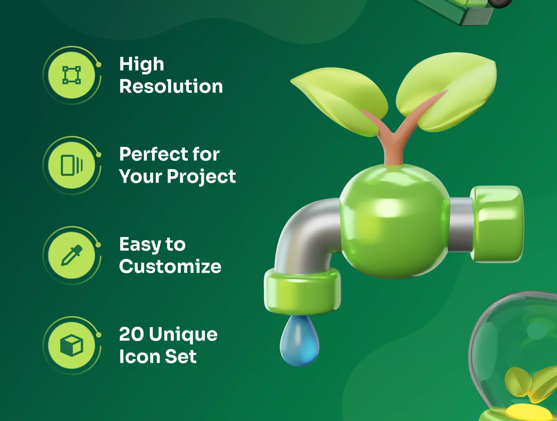 Greeny is a unique 3D Icon pack with various Environment, Energy, Ecology, and Sustainable Living niche. 3D icons are easy to edit and ready to use for your needs. Make your next product and project even more stunning with 3D icons.