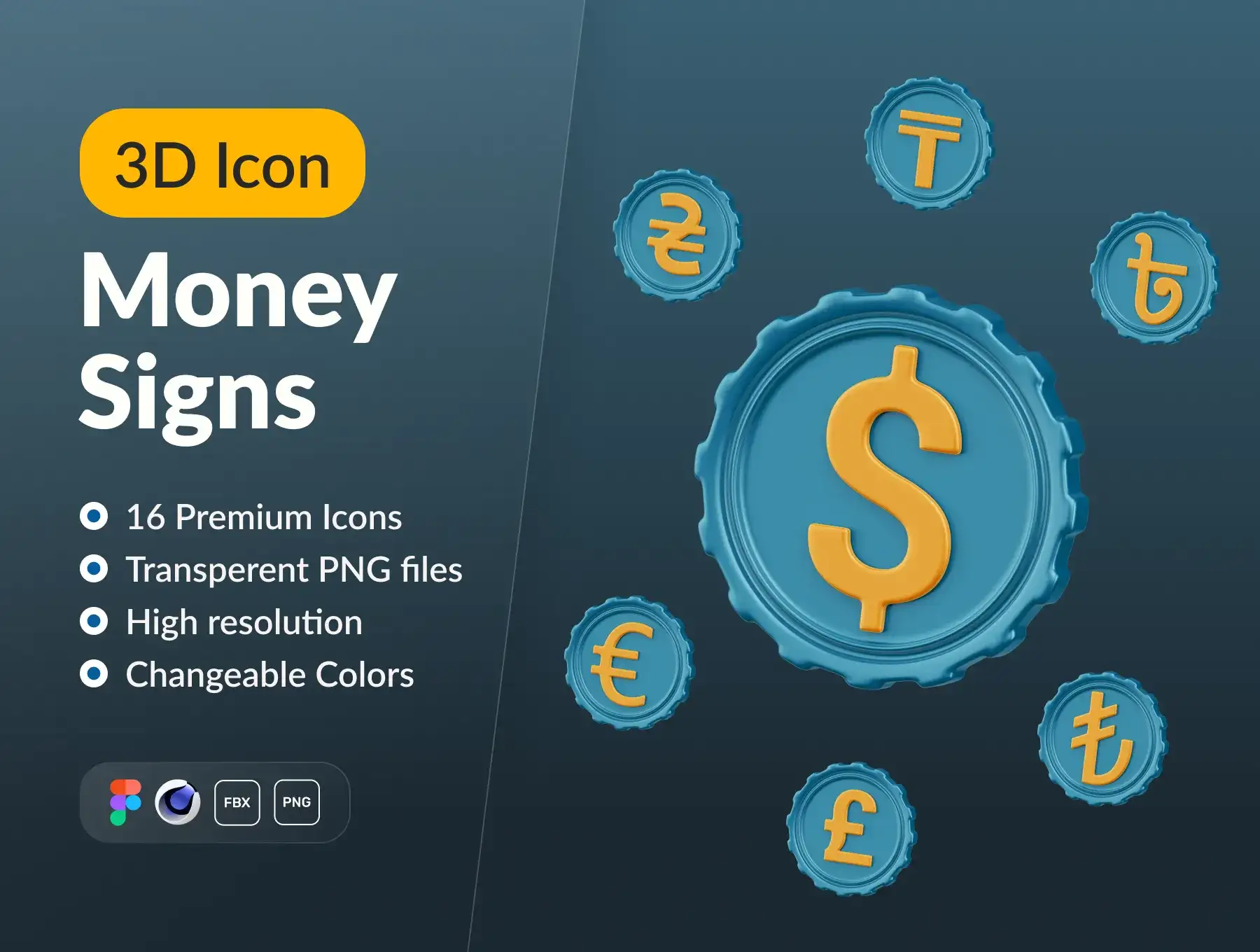 Money Signs are a set of unique 3D icons suitable for any project related to money or any other. With these coins, you can easily complement your unique product or offer.