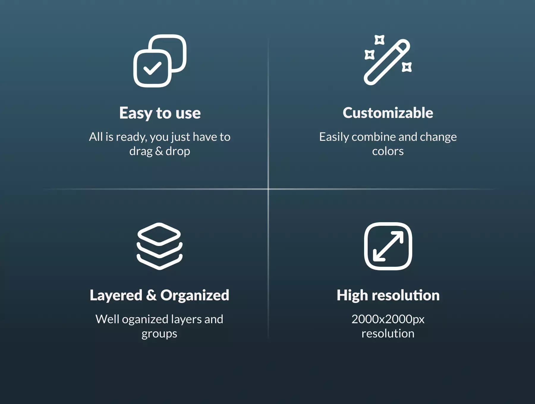 There are 16 unique icons in the set, made in the same style. You can easily change the color according to your brand or tasks.