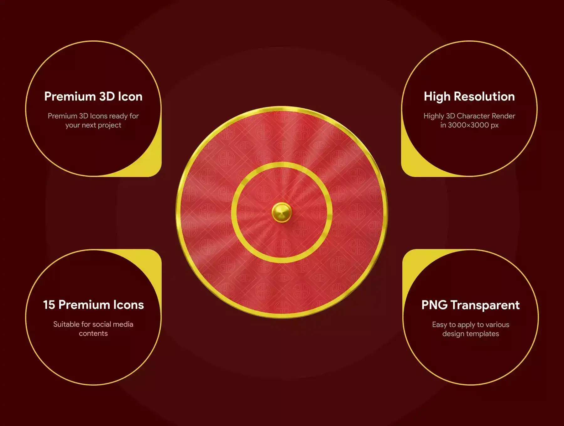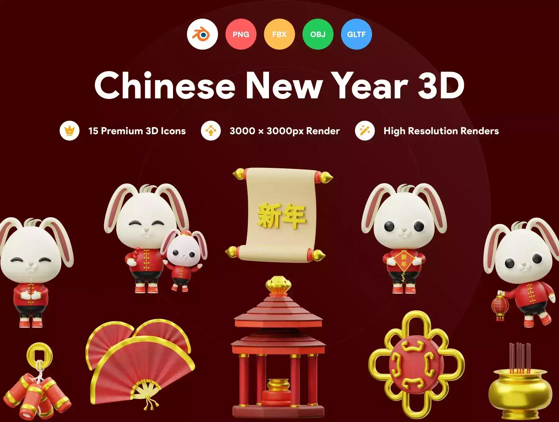15 ready-made Chinese New Year 3D Icon file objects for Websites, Mobile Apps, and more. Enhance your designs with 3D Assets.
