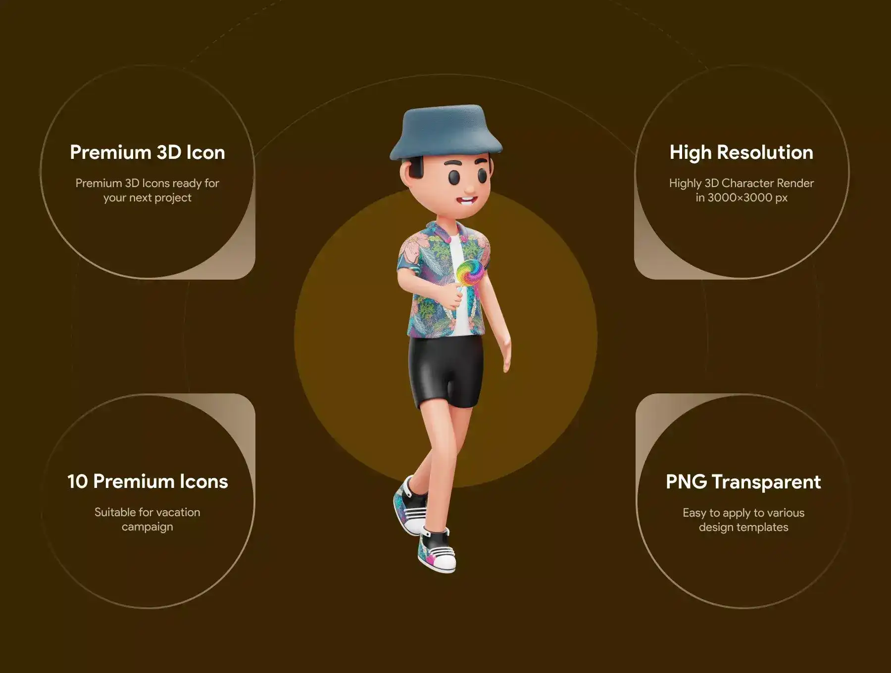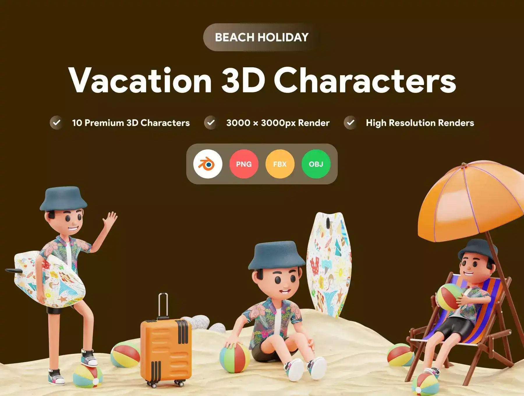 10 ready-made Vacation 3D Character file objects for Websites, Mobile Apps, and more. Enhance your designs with 3D Assets.