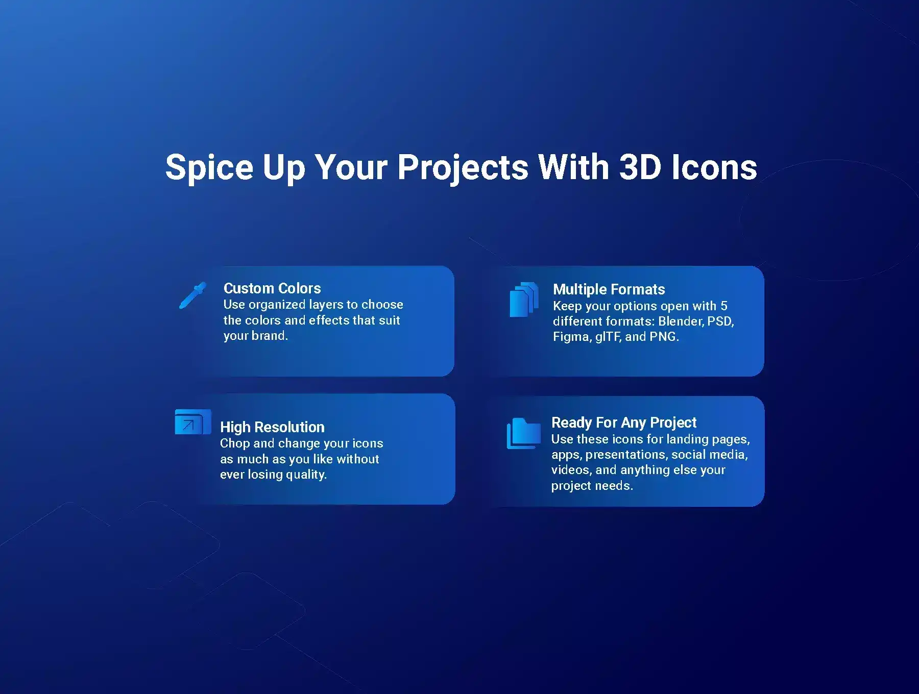 In addition to their awesome 3D design, these icons can be customized as well! Change their shape, size, and color, and make them perfect for your project. Enjoy!
