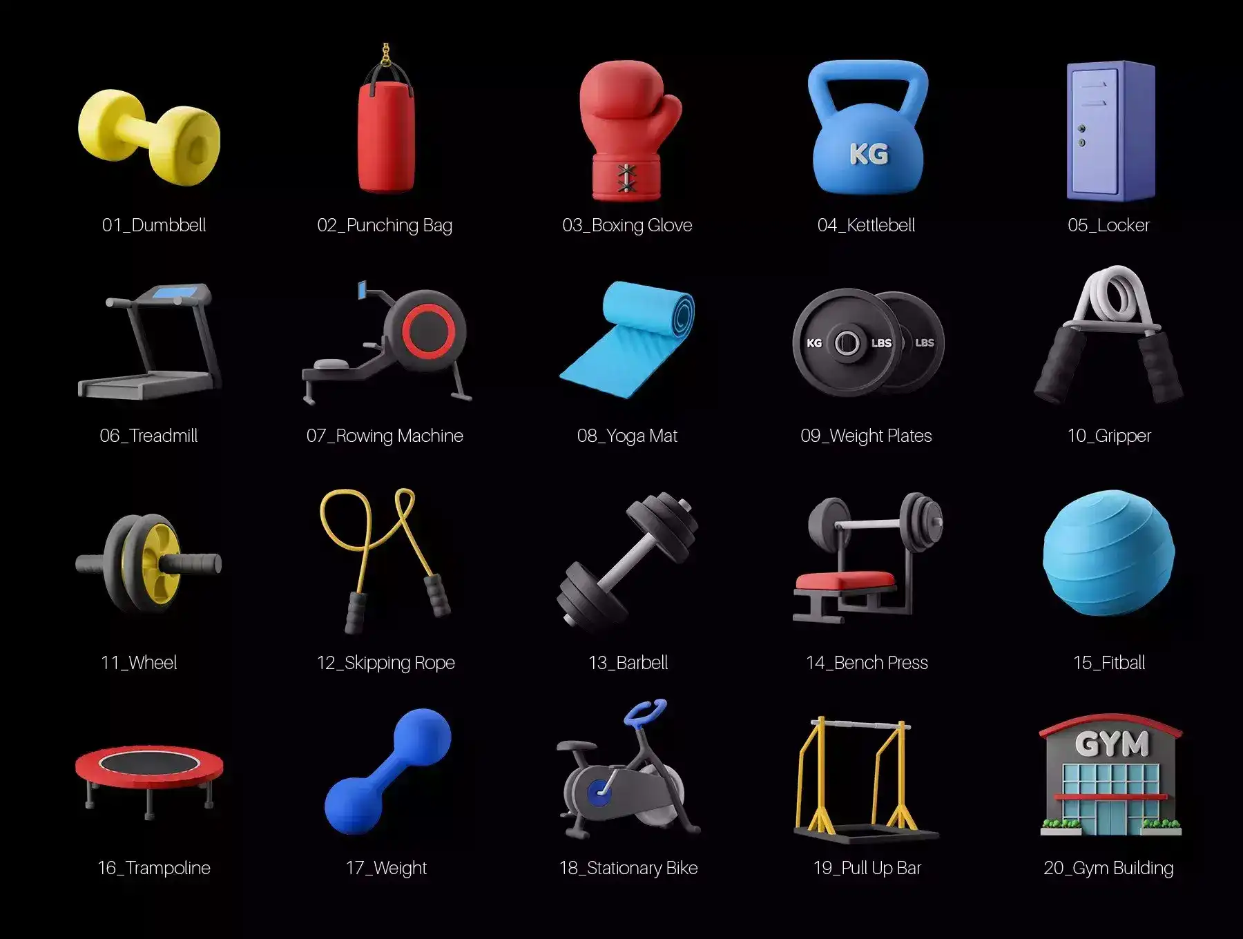 Design your fitness or gym theme project and make them stand out and unique with this 3d icon illustration set. You'll get 20 high quality and well made fitness gym equipment theme 3d icons, available in 5 formats, Editable Photoshop Files, 3D Blender, 3D OBJ Files, PNG Transparent, and Isolated JPG.
