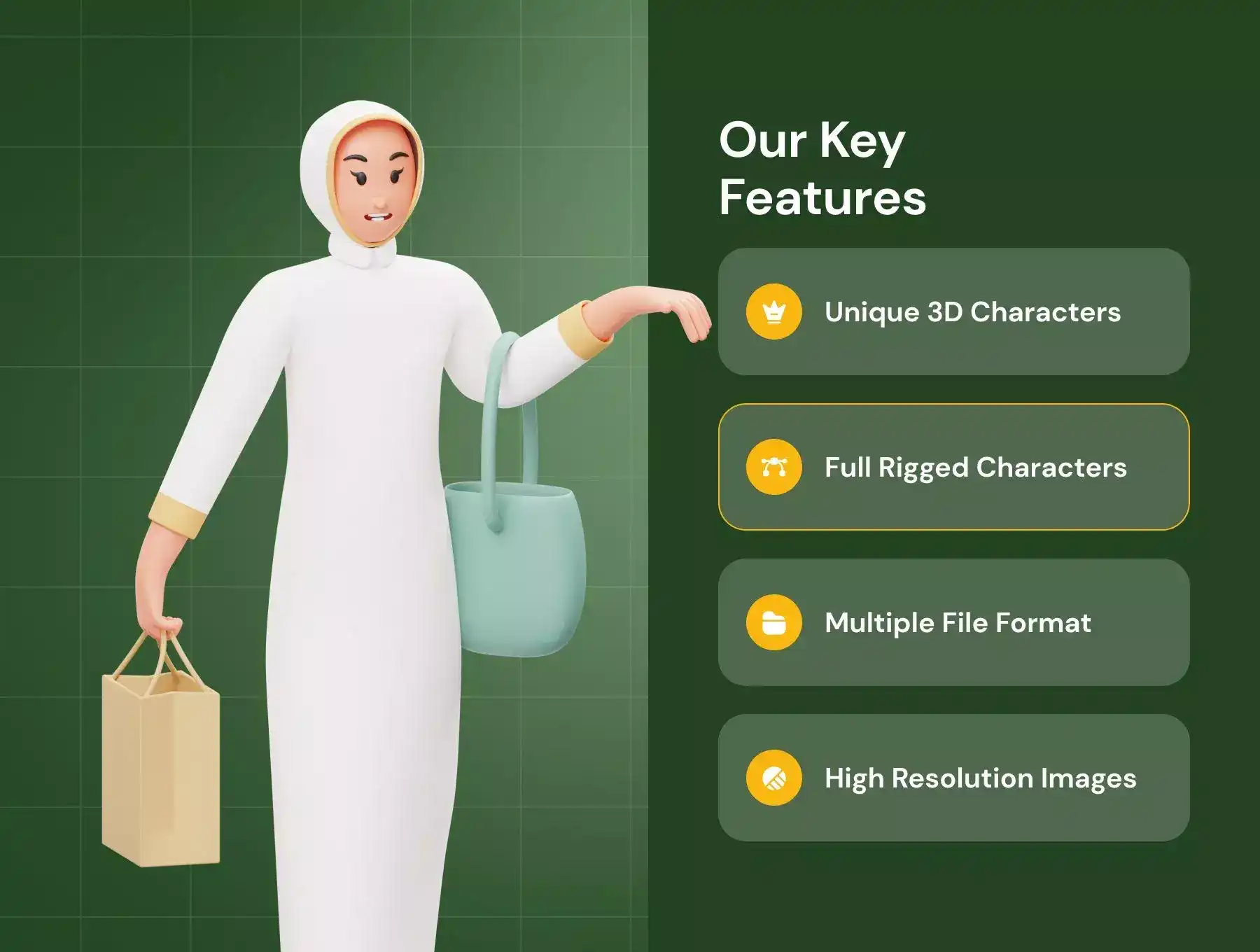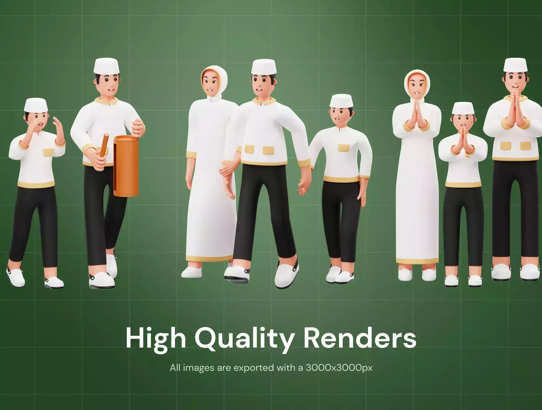 8 ready-made Muslim Ramadan 3D Character file objects for Websites, Mobile Apps, and more. Enhance your designs with 3D Assets.