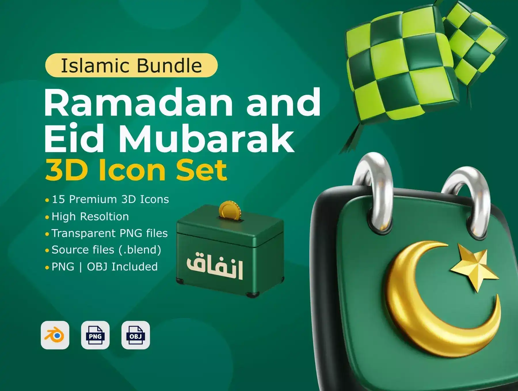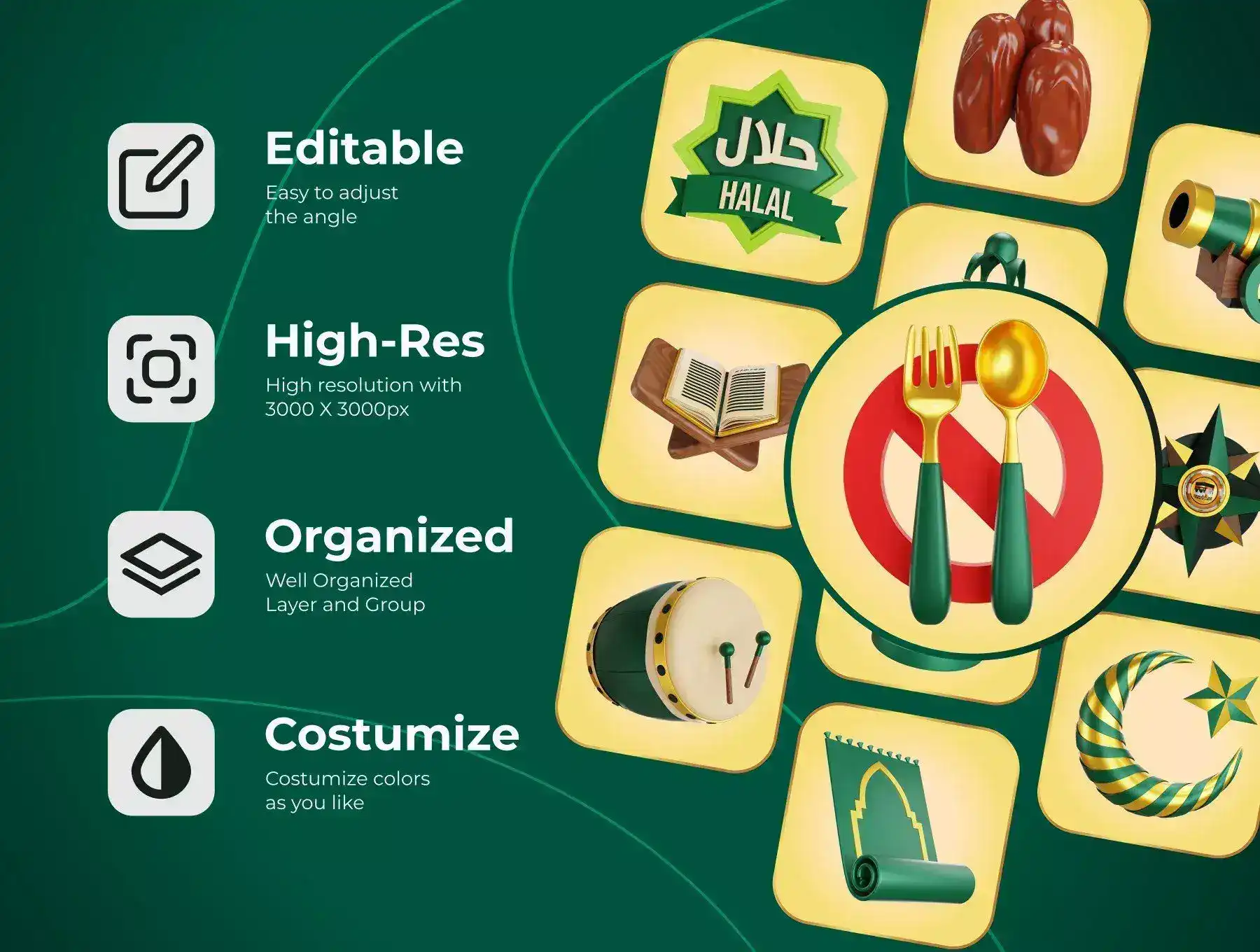 3D icon set of Ramadan and eid Mubarak is a collection of custom designed icons that are created specifically to reflect the themes and symbols of the holy month. These icons can be used in a variety of marketing materials, including social media posts, digital ads, landing page, apps, and any project acording to your needs.