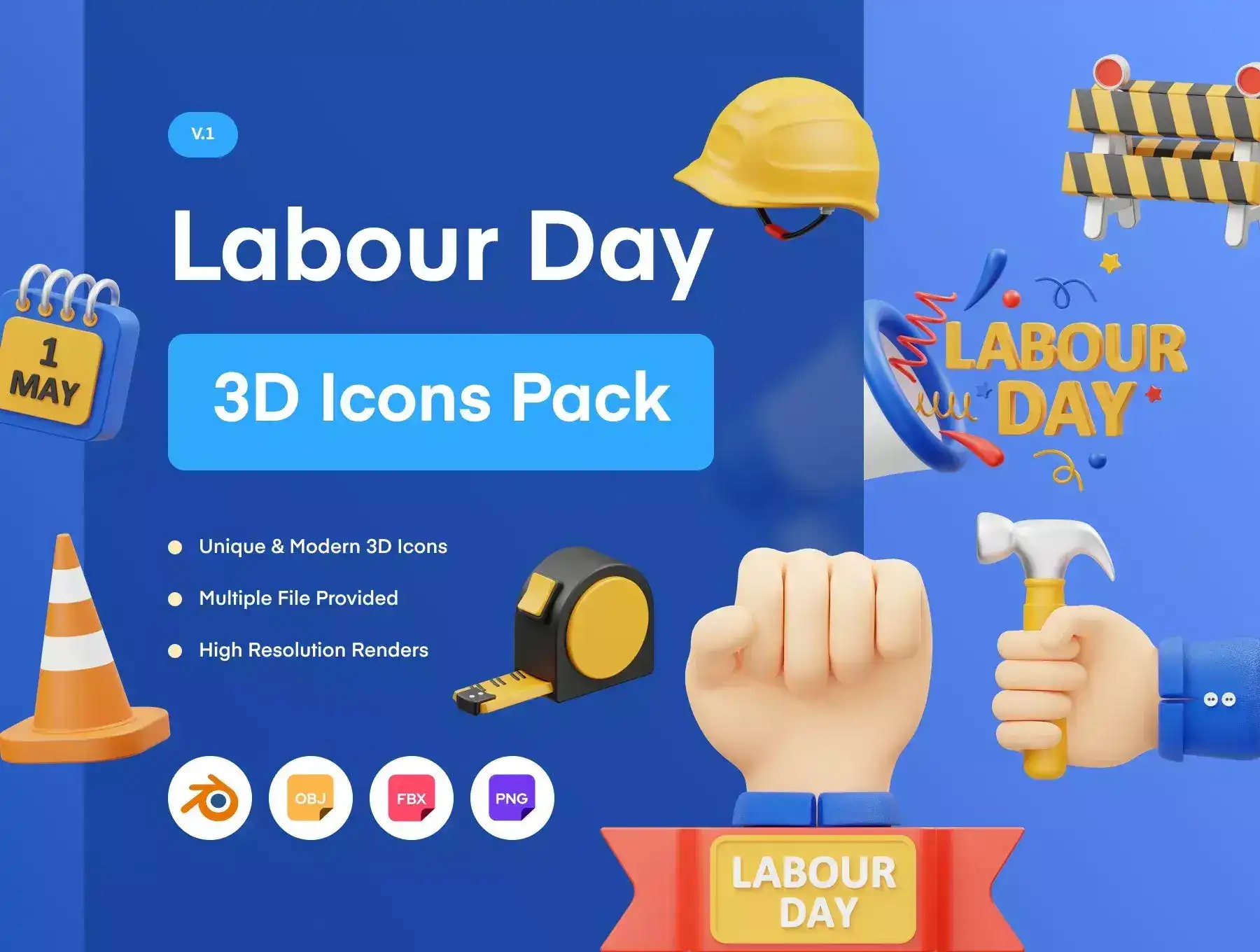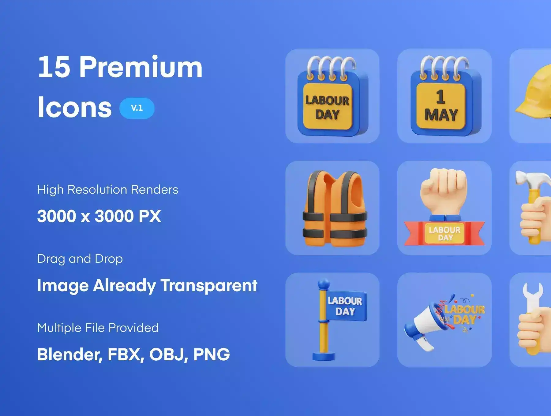 15 ready-made Labour Day 3D Icon file objects for Websites, Mobile Apps, and more. Enhance your designs with 3D Assets.