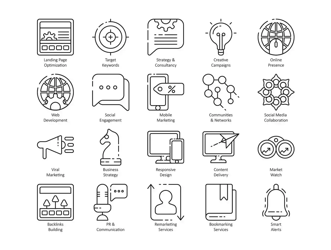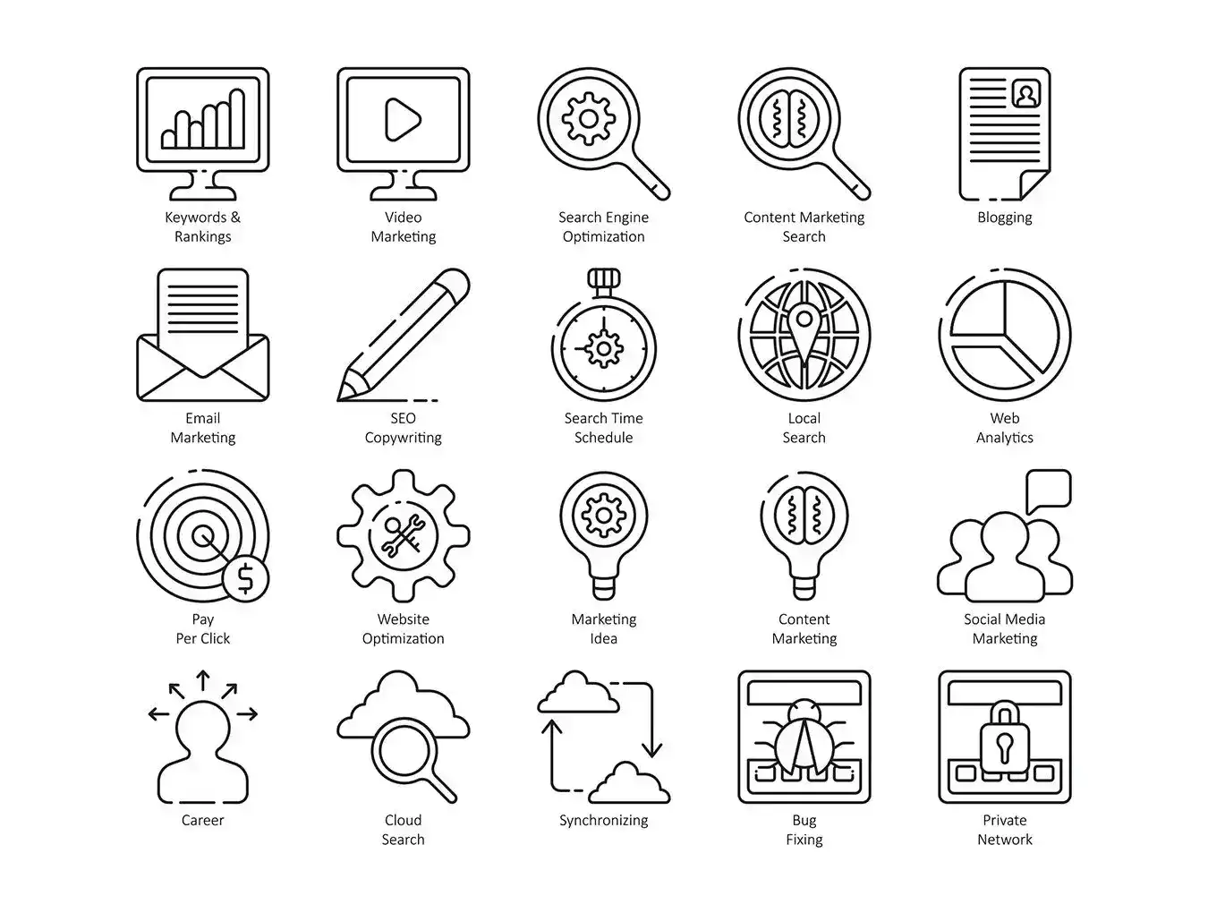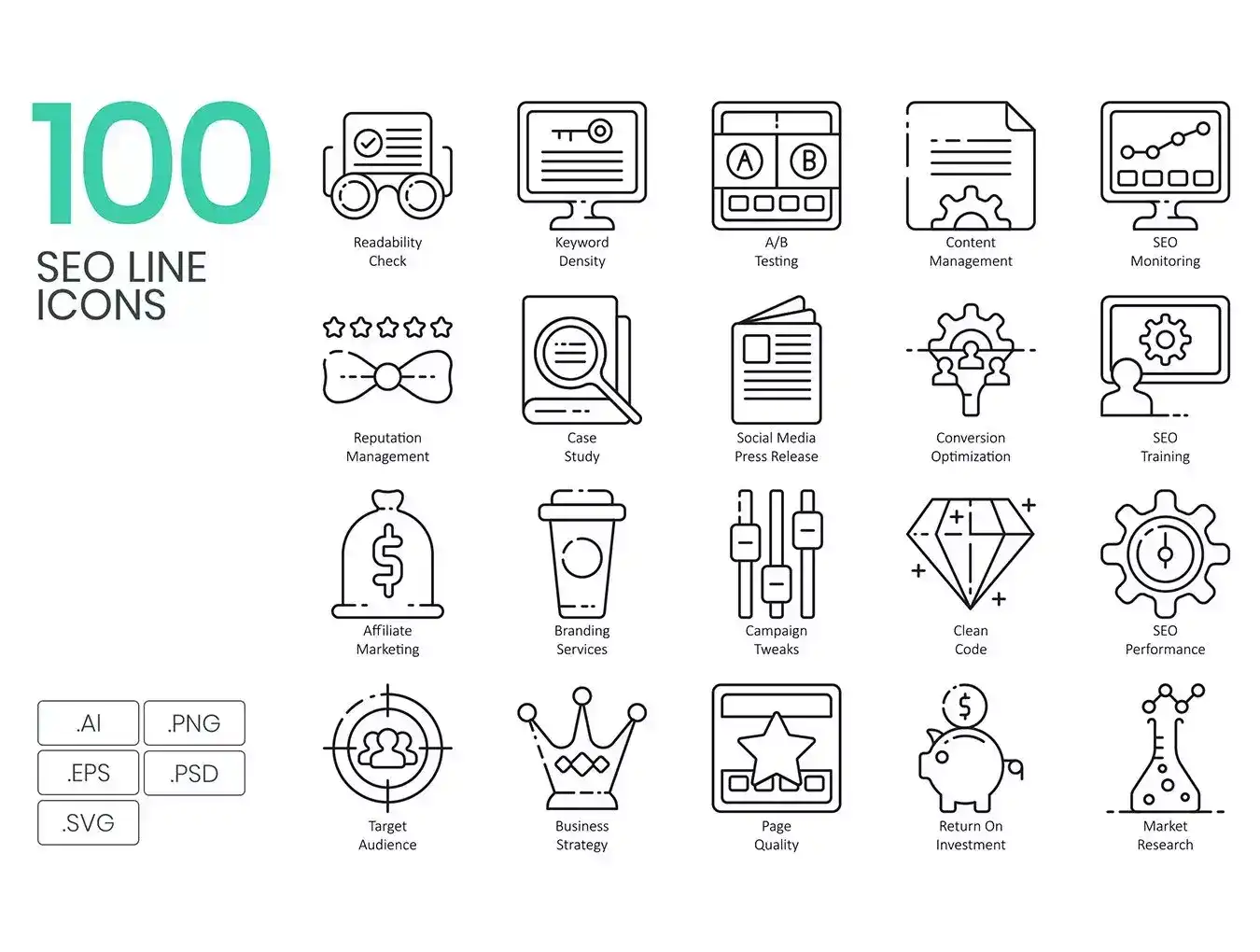 Featuring 100 trendy linear-styled icons related to SEO, SEM, Online Advertising concepts. Icons include: AB testing, Affiliate marketing, backlink building, blogging, bookmarking, branding, bug fixing, business solution, strategy, campaign launch, timing, tweak, career, case study... click on Preview button to view the full set 🙂