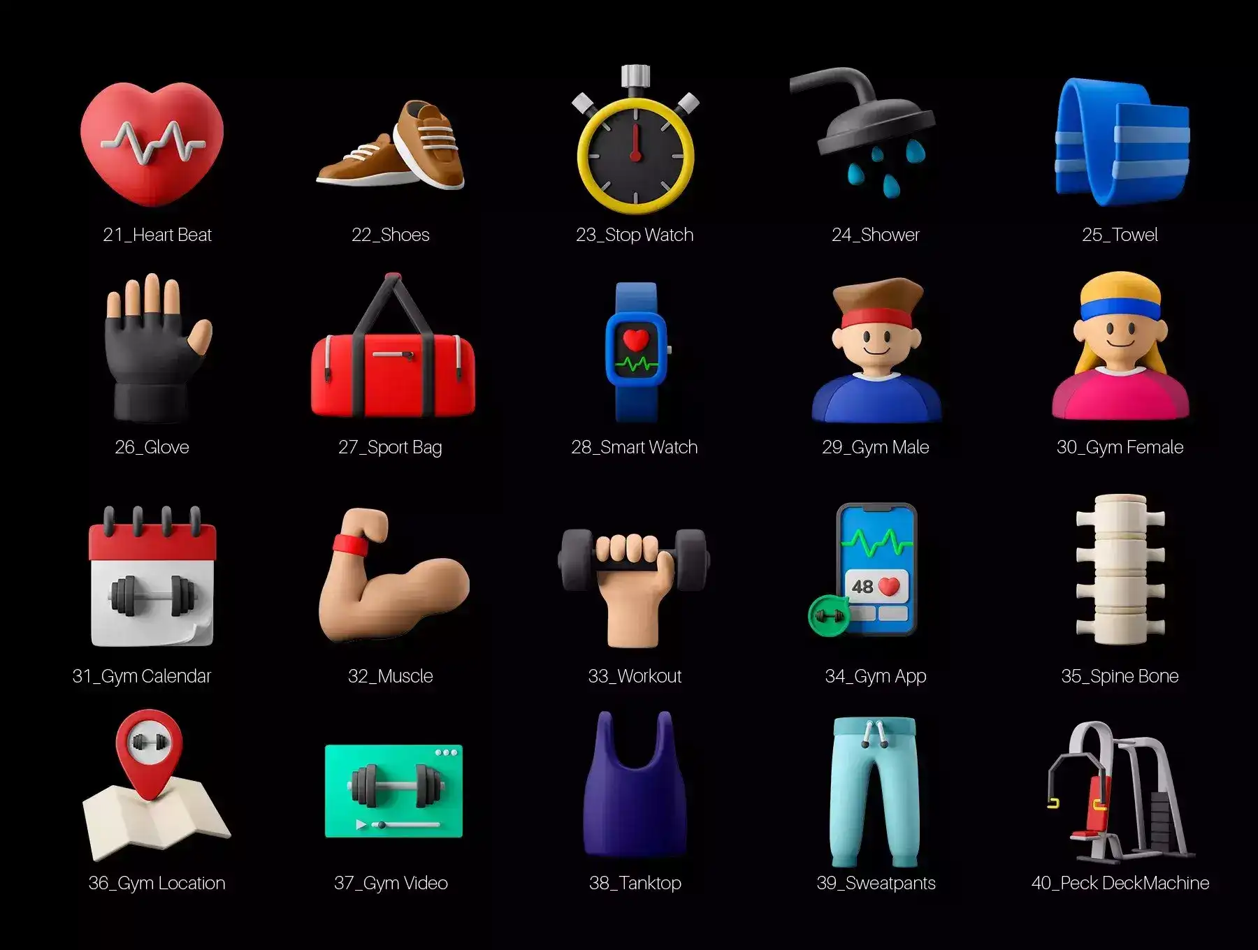 Design your fitness or gym theme project and make them stand out and unique with this 3d icon illustration set. You'll get 20 high quality and well made fitness gym equipment theme 3d icons, available in 5 formats, Editable Photoshop Files, 3D Blender, 3D OBJ Files, PNG Transparent, and Isolated JPG.