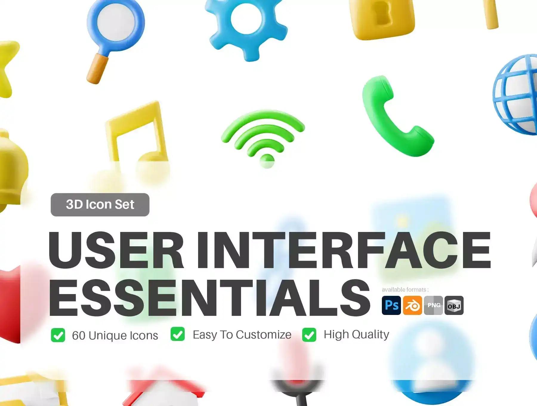 Design your user interface design project and make them stand out from the rest with this 3d icon illustration set. 60 high quality and highly customizable user interface essentials theme 3d icons, available in 5 formats, Editable Photoshop Files, 3D Blender, 3D OBJ Files, PNG Transparent, and Isolated JPG.