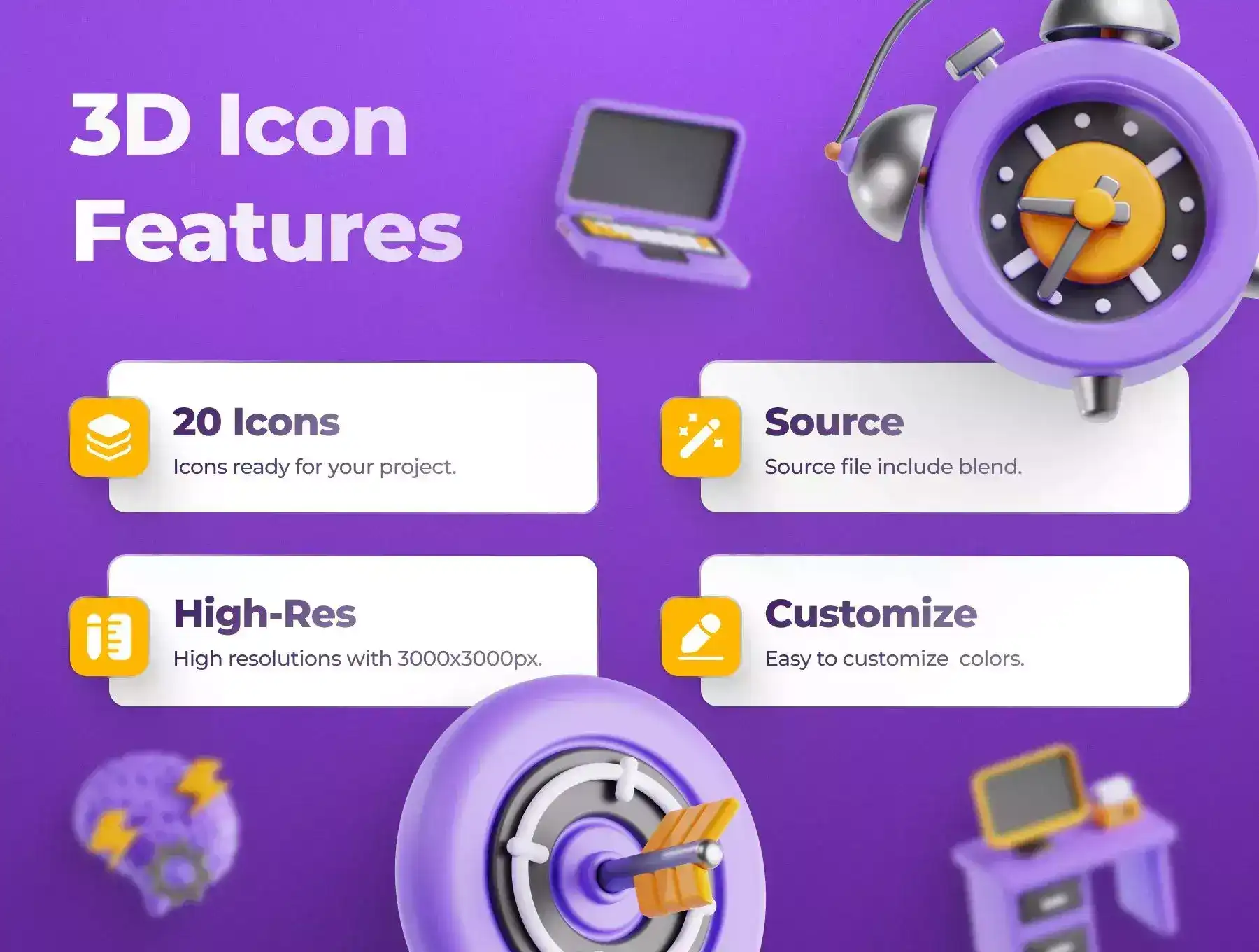 Elevate your mobile app, UI/UX, and web design projects with the 3D Productivity Icon Set, adding a unique and eye-catching element to your designs.