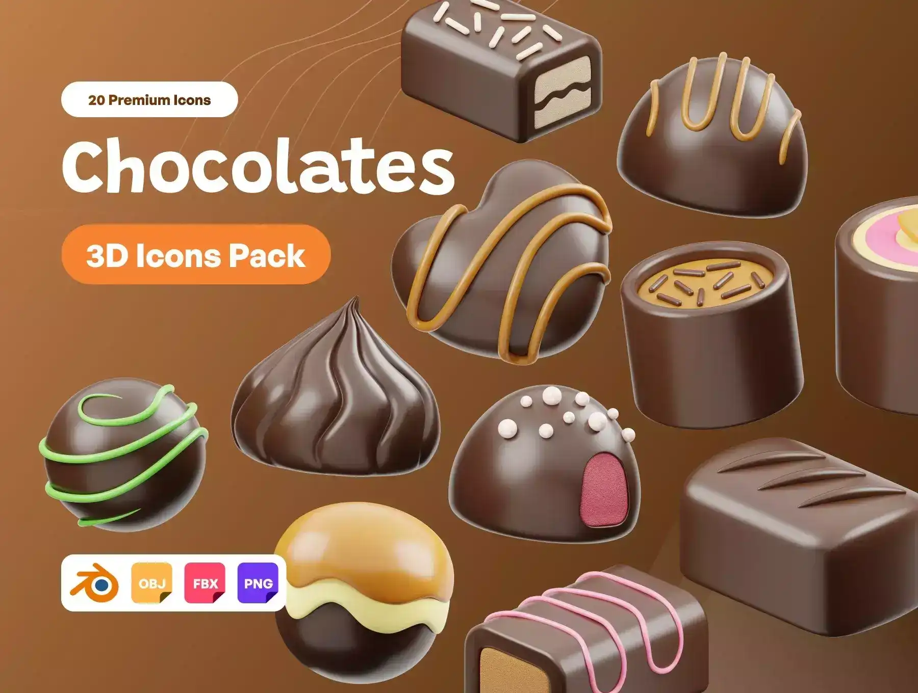 20 ready-made Chocolate 3D Icon file objects for Websites, Mobile Apps, and more. Enhance your designs with 3D Assets.