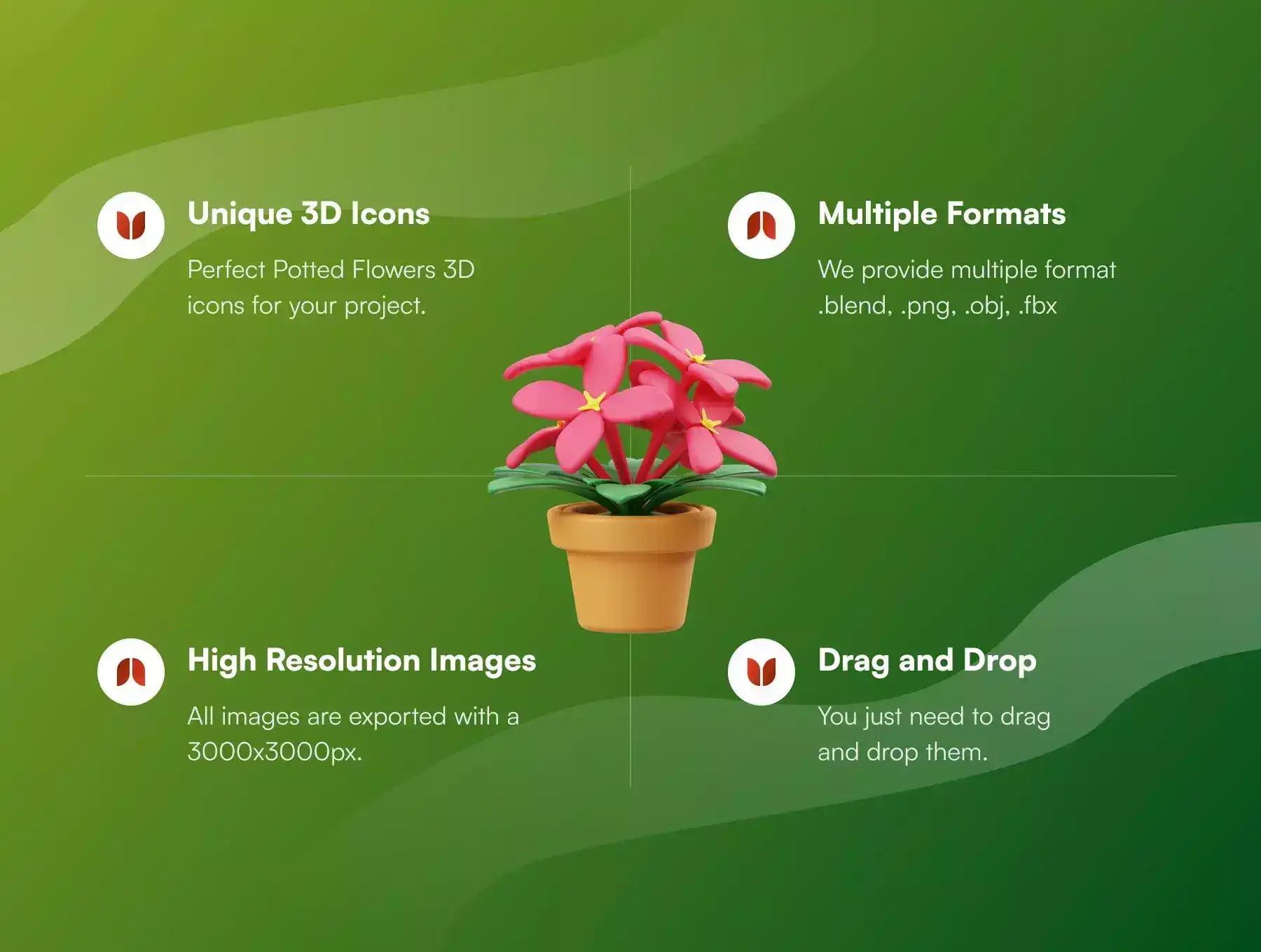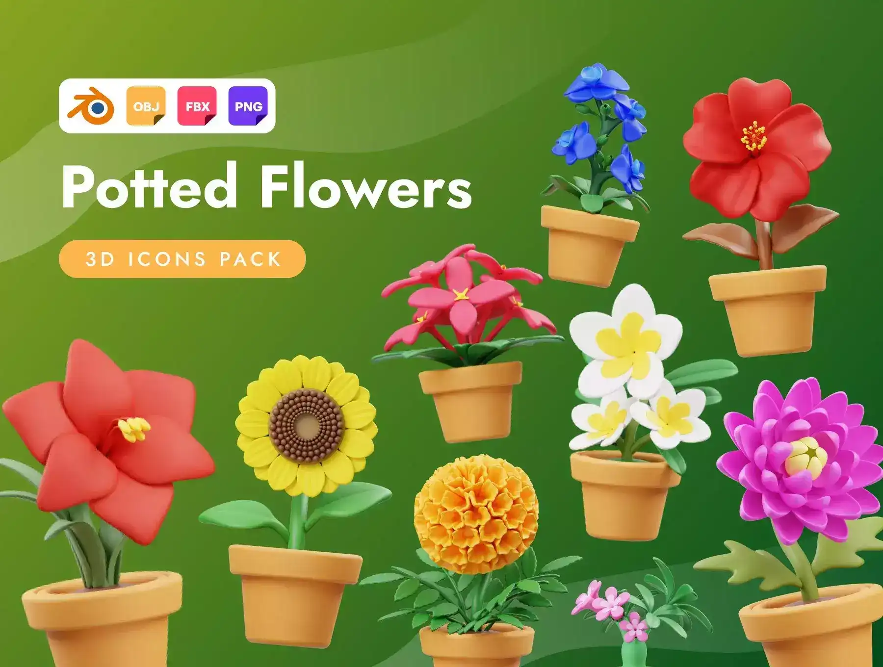15 ready-made Potted Flower 3D Icon file objects for Websites, Mobile Apps, and more. Enhance your designs with 3D Assets.