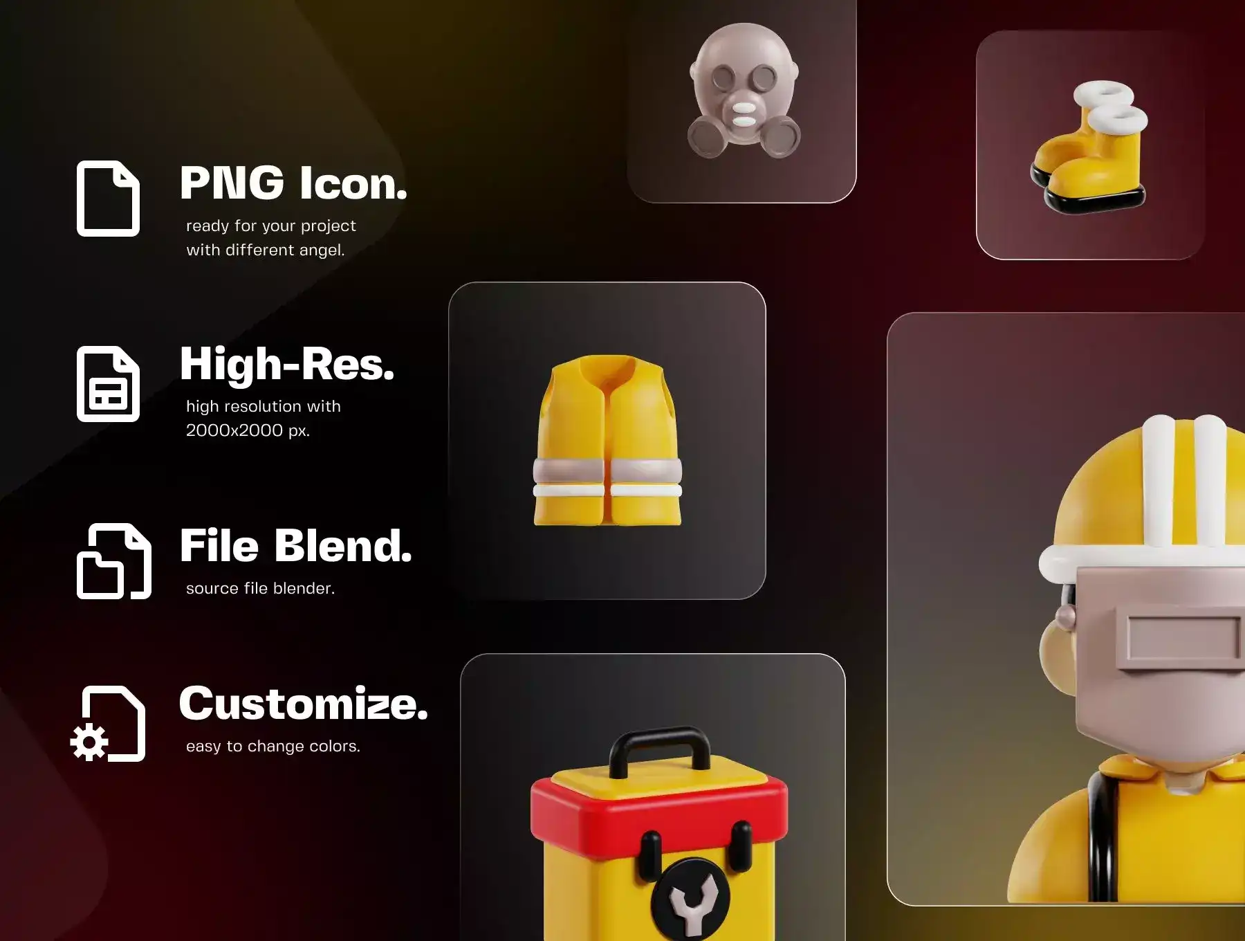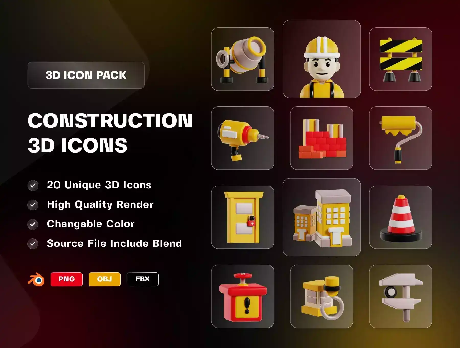 20 Construction 3D Icon Pack for your designs, UI, website and more!you will get a High Resolution 2000x2000 PNG file and Blend File.