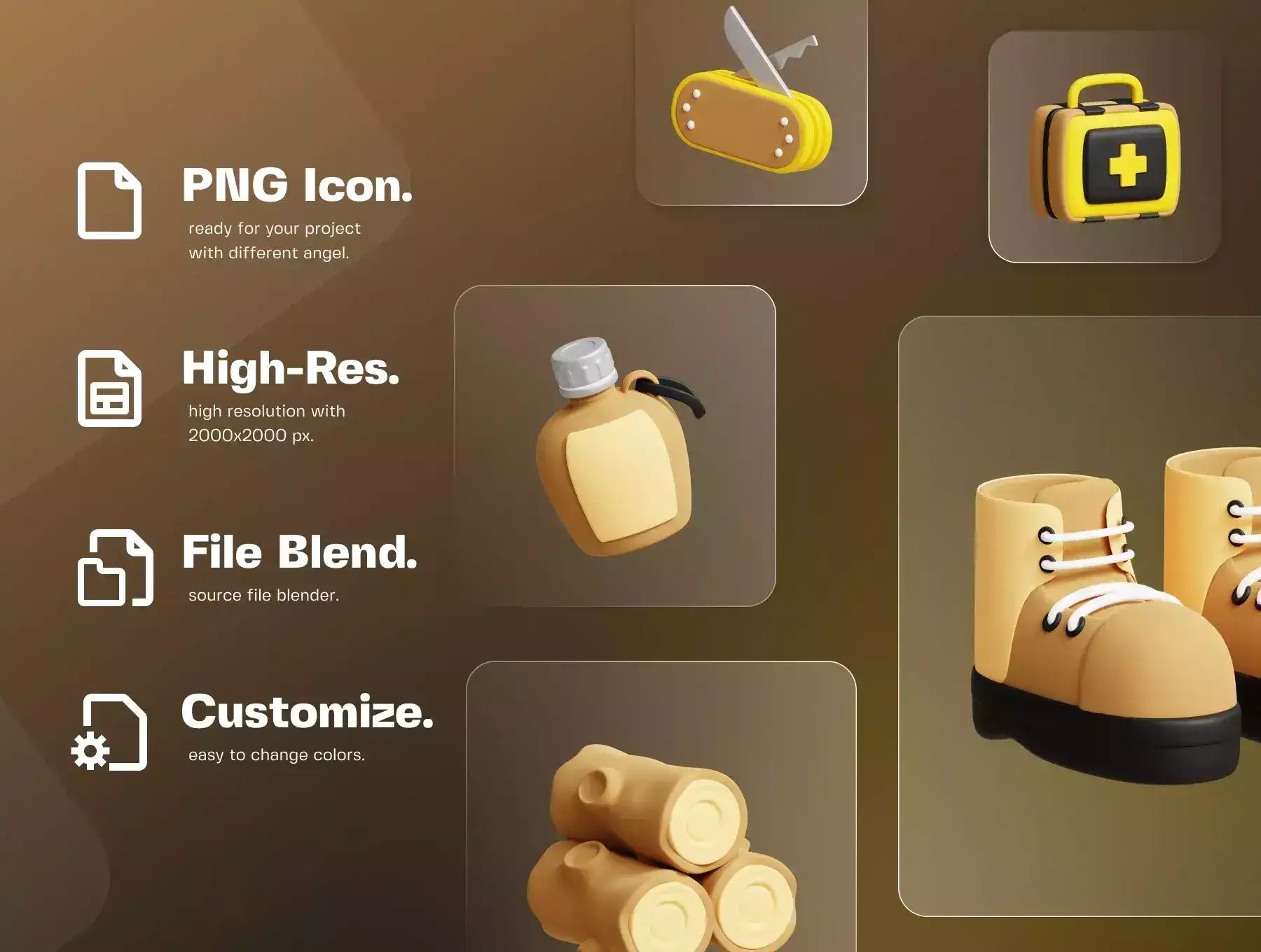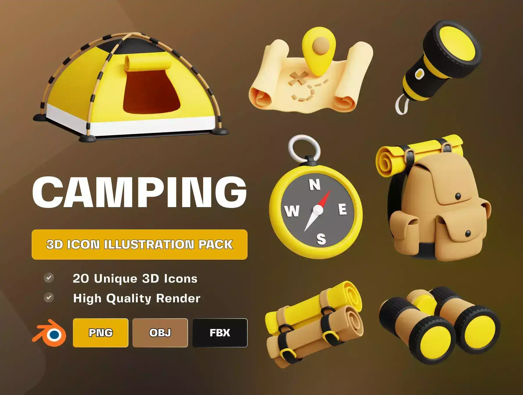 20 Camping 3D Icon Pack for your designs, UI, website and more!you will get a High Resolution 2000x2000 PNG file and Blend File.