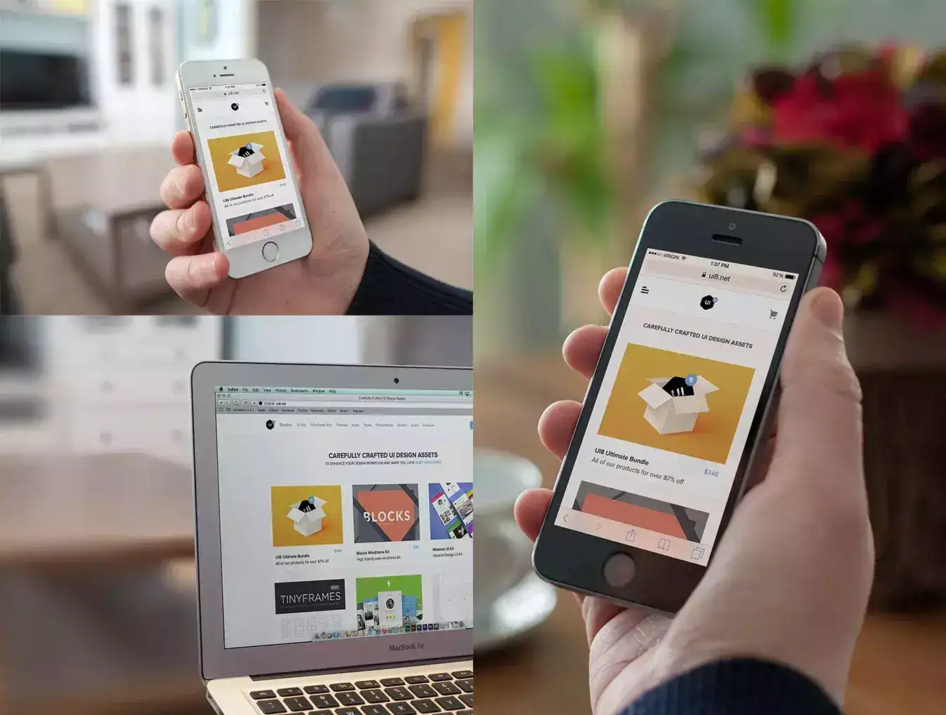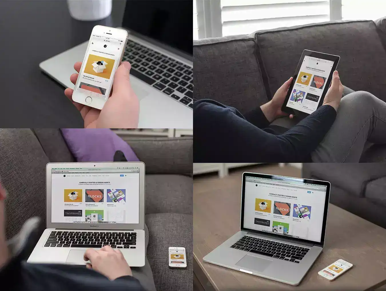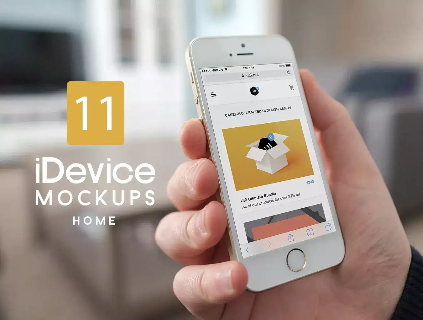 iDevice Home is a collection of 11 Apple device mockups lounging around the house, featuring the iPhone 5s, Macbook Air, Macbook Pro Retina, & iPad Retina.